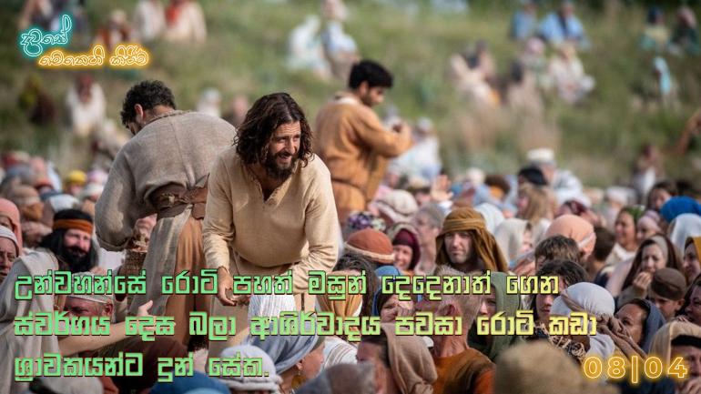 උන්වහන්සේ රොටි පහත් මසුන් දෙදෙනාත් ගෙන ස්වර්ගය දෙස බලා ආශිර්වාදය පවසා රොටි කඩා ශ්රාවකයන්ට දුන් සේක.