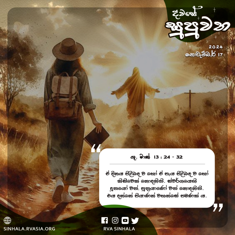 32 ”ඒ දිනය පිළිබඳ ව හෝ ඒ පැය පිළිබඳ ව හෝ කිසිවෙක් නොදනිති; ස්වර්ගයෙහි දූතයෝ වත්, පුත්රයාණෝ වත් නොදනිති; එය දන්නේ පියාණන් වහන්සේ පමණක් ය.