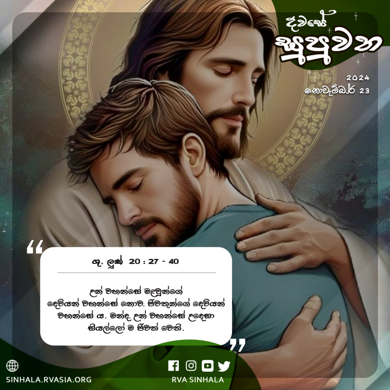 27 පුනරුජ්ජීවනයක් නැතැ යි කියන සද්දුසිවරුන්ගෙන් සමහරෙක් ජේසුස් වහන්සේ වෙත අවුත්, 28 ”ගුරුදේවයෙනි, යම් මිනිසෙකු භාර්යාව ජීවත් ව සිටිය දී දරුපල නොලැබ මළොත්, ඔහුගේ සහෝදරයා ඒ භාර්යාව පාවාගෙන, තම සහෝදරයාගේ නමට දරුවන් ඉපදවිය යුතු යයි මෝසෙස් ලියා ඇත. 29 ඉදින්, සහෝදරයෝ සත් දෙනෙක් සිටියහ. පළමුවැන්නා භාර්යාවක පාවාගෙන දරුපල නොලබා මළේ ය. 30 දෙවැන්නාත් තුන්වැන්නාත් ඇය පාවා ගත්හ. 31 සත් දෙන ම එසේ දරුපල නොලබා මළෝ ය. 32 පසුව ඒ ස්ත්රියත් මළා ය. 33 සත් දෙනාම ඈ පාවාගත් බැවින්, පුනරුජ්ජීවනයේ දී ඈ ඔවුන්ගෙන් කවරකුගේ භාර්යාව වන්නී දැ”යි ඇසූ හ. 34 ජේසුස් වහන්සේ පිළිතුරු දෙමින්, ”මේ යුගයට අයත් වූවෝ ආවාහ විවාහ වන්නාහු ය; 35 එහෙත් එන යුගයට හා පුනරුජ්ජීවනයට පැමිණීමට වරම් ලත් අය ආවාහ වන්නේ වත් විවාහ වන්නේ වත් නැත. 36 ඉන්පසු ඔවුන්ට මරණයක් නැත. ඔව්හු දේව දූතයන්ට සම වෙති. පුනරුජ්ජීවන වරය ලත් බැවින් ඔව්හු දෙවියන් වහන්සේගේ පුත්රයෝ ය. 37 ‘සමිඳාණන් වහන්සේ ආබ්රහම්ගේ දෙවියන් වහන්සේ ය, ඊසාක්ගේ දෙවියන් වහන්සේ ය, ජාකොබ්ගේ දෙවියන් වහන්සේ ය’යි කීමෙන් මෝසෙස් පවා, පුනරුජ්ජීවනයක් ඇති බව පඳුර පිළිබඳ පාඨයෙහි පෙන්වා දී ඇත. 38 උන් වහන්සේ මළවුන්ගේ දෙවියන් වහන්සේ නොව, ජීවතුන්ගේ දෙවියන් වහන්සේ ය. මන්ද, උන් වහන්සේ උදෙසා සියල්ලෝ ම ජීවත් වෙති”යි වදාළ සේක. 39 එවිට විනයධරයන්ගෙන් සමහරෙක් උත්තර දෙමින්, ”ගුරුදේවයෙනි, ඔබේ කතාව කදිම ය”යි කී හ. 40 උන් වහන්සේගෙන් තවත් කිසි ප්රශ්නයක් ඇසීමට ඔවුන්ට ධෛර්ය නොතිබිණි.