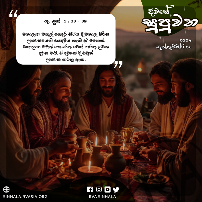 33 එවිට ඔව්හු උන් වහන්සේට කතා කොට, ”ජොහන්ගේ ගෝලයෝ නොයෙක් වර උපවාස පවත්වා යාච්ඤා පුද කරති; පරිසිවරුන්ගේ ගෝලයෝත් එසේ ම කරති. එහෙත් ඔබේ ශ්රාවකයෝ කමින් බොමින් සිටිති”යි කී හ. 34 ජේසුස් වහන්සේ, පිළිතුරු දෙමින්, ”මනාලයා මඟුල් ගෙදර සිටිය දී මනාල පිරිස උපවාසයෙහි යෙදවිය හැකි ද? 35 එහෙත්, මනාලයා ඔවුන් කෙරෙන් වෙන් කරනු ලබන දවස එයි, ඒ දවසේ දී ඔවුන් උපවාස කරනු ඇතැ”යි වදාළ සේක.
