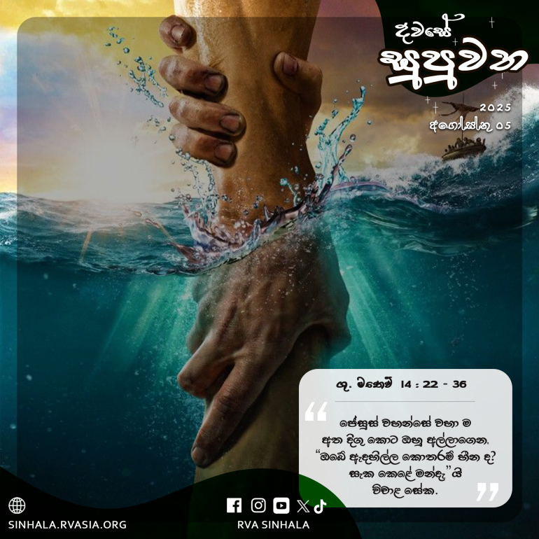 22 ඉන්පසු උන් වහන්සේ සමූහයා පිටත් කර හරින අතර, ඔරුවට නැඟී, තමන්ට පළමුවෙන් එගොඩට යන ලෙස ශ්රාවකයන්ට නියම කළ සේක. 23 උන් වහන්සේ ජනකාය යැවූ පසු, යාච්ඤා කරන පිණිස වෙන් ව කන්දට වැඩිය සේක. සවස් වූ කල්හි උන් වහන්සේ තනි ව එහි සිටි සේක. 24 සුළඟ තදින් හැමූ බැවින් ඔරුව එවේලෙහි තරංගවල හැපෙමින්, ගැටෙමින් මුහුද මැද තිබිණි. 25 අලුයම තුනටත් හයටත් අතර උන් වහන්සේ ඔවුන් වෙත මුහුද මතුපිට ඇවිදගෙන ආ සේක. 26 ශ්රාවකයෝ උන් වහන්සේ මුහුද මත ඇවිදගෙන එනු දැක, කලබල වී, ”ඒ අවතාරයකැ”යි කියමින්, බියෙන් මොරගැසූ හ. 27 එහෙත්, ජේසුස් වහන්සේ එකෙණෙහි ම ඔවුන්ට කතා කොට, ”ධෛර්යවත් වන්න; මේ මම ය; බිය නොවන්නැ”යි වදාළ සේක. 28 පේදුරු උත්තර දෙමින්, ”ස්වාමීනි, ඔය ඔබ වහන්සේ නම්, වතුර මත ඔබ වෙත එන්න මට අණ කළ මැනවැ”යි කී ය. 29 ”එන්නැ”යි උන් වහන්සේ වදාළ සේක. එවිට පේදුරු ඔරුවෙන් බැස, ජේසුස් වහන්සේ වෙත වතුර මත ඇවිදගෙන ගියේ ය. 30 එහෙත්, ඔහු මාරුතය වේගවත් බව දැක, බිය වී ගිලෙන්න පටන්ගෙන, ”ස්වාමීනි, මා බේරාගත මැනවැ”යි මොරගැසී ය. 31 ජේසුස් වහන්සේ වහා ම අත දිගු කොට ඔහු අල්ලාගෙන, ”ඔබේ ඇදහිල්ල කොතරම් හීන ද? සැක කෙළේ මන්දැ”යි විචාළ සේක. 32 ඔවුන් දෙදෙන ඔරුවට නැඟුණු කල සුළඟ නැවතිණි. 33 එවිට ඔරුවේ උන් අය, ”ඒකාන්තයෙන් ම ඔබ දෙවියන් වහන්සේගේ පුත්රයාණෝ ය”යි කියමින් උන් වහන්සේට පසඟ පිහිටුවා වැඳ නමස්කාර කළහ.