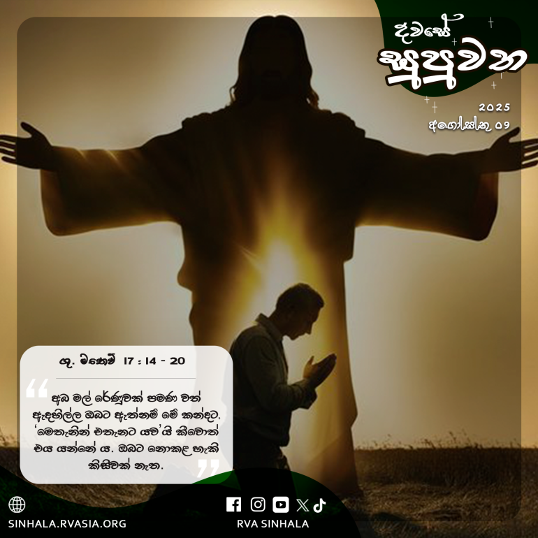 19 එවිට ශ්රාවකයෝ පෞද්ගලික ව ජේසුස් වහන්සේ වෙතට අවුත්, ”ඒ දුෂ්ටාත්මය දුරු කරන්න අපට බැරි වූයේ මන්දැ”යි ඇසූහ. 20 උන් වහන්සේ කතා කොට මෙසේ වදාළ සේක: ”ඔබගේ ඇදහිල්ල මදිකම නිසා ය. සැබැවින් ම මම ඔබට කියමි: අබ මල් රේණුවක් පමණ වත් ඇදහිල්ල ඔබට ඇත්නම් මේ කන්දට, ‘මෙතැනින් එතැනට යව’යි කීවොත් එය යන්නේ ය; ඔබට නොකළ හැකි කිසිවක් නැත.”