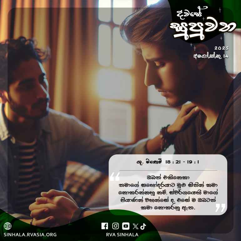 31 ඔහුගේ සහකාර දාසයෝ සිදුවූ දේ දැක, අතිශයින් ශෝක වී, අවුත් සිදුවූ සියල්ල තම ස්වාමියාට දැන්වූ හ. 32 එවිට ඔහුගේ ස්වාමියා ඔහු කැඳවා කතා කොට, ‘දුෂ්ට දාසය, නුඹේ ඉල්ලීම නිසා මම ඒ ණය සියල්ල නුඹට කමා කෙළෙමි. 33 මා නුඹට අනුකම්පා කළාක් මෙන් ම, නුඹත් නුඹේ සහකාර දාසයාට අනුකම්පා කළ යුතුව තිබුණා නොවේ දැ’යි ඇසී ය. 34 ඔහුගේ ස්වාමියා කෝප ව ඔහු තමාට ගෙවිය යුතු සම්පූර්ණ ණය ගෙවන තෙක් ඔහු වධකයන්ට භාර දුන්නේ ය. 35 ඔබත් එකිනෙකා තමාගේ සහෝදරයාට මුළු සිතින් කමා නොකරන්නහු නම්, ස්වර්ගයෙහි වැඩ වසන මාගේ පියාණන් වහන්සේ ද, එසේ ම ඔබටත් කමා නොකරනු ඇත.”