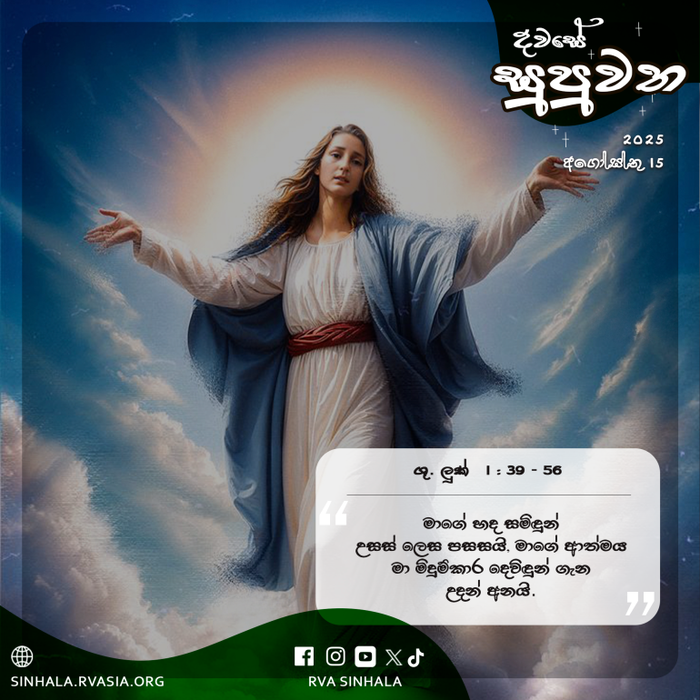 39 දින ගණනකට පසු මරිය තුමී නැඟිට ජුදා කඳුකරයෙහි නුවරකට යුහු ව ගොස්, 40 සෙකරියස්ගේ ගෙට ඇතුළු වී, එලිසබෙත් හට ආචාර කළා ය. 41 එලිසබෙත් මරිය තුමියගේ ආචාර බස් ඇසූ කල ඇගේ කුසෙහි දරුවා ඉපිලෙන්නට වන. එවිට එලිසබෙත් ශුද්ධාත්මයාණන්ගෙන් පූර්ණ ව, 42 මහ හඬින් උදන් අනමින්, ”ඔබ වනිතාවන් අතර අතිශයින් ආශීර්වාද ලද්දී ය. ඔබ කුස ඔත් දරු ඵලය ද ආශීර්වාද ලද්දේ ය. 43 මාගේ සමිඳාණන් වහන්සේගේ මෑණියන් මා වෙත පැමිණීමට තරම් මම කවරෙක් ද? 44 මක්නිසා ද ඔබේ ආචාර හඬ මා සවන් ගත වූ කෙණෙහි ම මා කුසෙහි දරුවා ප්රීතියෙන් ඉපිලී ගියේ ය. 45 සමිඳාණන් වහන්සේගේ නාමයෙන් තමන් හට දුන් පොරොන්දුව ඉටුවන්නේ ම යයි විශ්වාස කළ තැනැත්තී භාග්යවන්ත ය”යි කීවා ය.