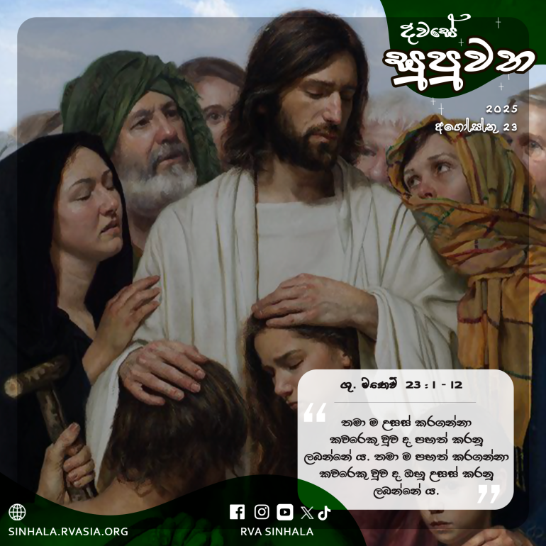 1 එකල ජේසුස් වහන්සේ සමූහයාටත්, සිය ශ්රාවකයන්ටත් කතා කොට මෙසේ වදාළ සේක: 2 ”විනයධරයෝ ද පරිසිවරු ද මෝසෙස්ගේ ව්යවස්ථාවලිය පිළිබඳ බලය ලත් අටුවාචාරීහු වෙති. 3 එබැවින් ඔවුන් ඔබට අණ කරන සියල්ල නොපිරිහෙළා පිළිපදින්න. එහෙත්, ඔවුන්ගේ ක්රියා අනුව නොයන්න. ඔව්හු එකක් කියති, අනිකක් කරති. 4 ඔව්හු ඉසිලිය නොහැකි මහ බර පොදි බැඳ මිනිසුන්ගේ කරේ තබති. එහෙත්, ඒ බර පොදි ඉසිලීමට සුළැඟිල්ලක තරම වත් ආධාරයක් දීමට කැමැති නොවෙති. 5 ඔවුන් හැම දෙය ම කරන්නේ මිනිසුන්ට පෙනෙන පිණිස ය. ඔව්හු ශුද්ධ ලියවිලි පාඨ සඳහන් බඳන පළල් කරගෙන නළලෙහි ද බාහුවල ද පළඳිති. වස්ත්රවල දාවලු මහත් කරති. 6 මංගල්යය භෝජනවල දී මූලාසනයට ද ධර්මශාලාවල දී ප්රධාන අසුන්වලට ද, 7 වෙළඳ පොළවල දී ගෞරවාචාර ලැබීමට ද, මිනිසුන් විසින් ‘ගුරුදේව’ කියා අමතනු ලැබීමට ද ප්රිය කරති. 8 එහෙත්, ඔබ ‘ගුරුදේව’ යයි කියවා නොගන්න. ඔබගේ ගුරුදේවයාණෝ එක් කෙනෙක් ම ය. ඔබ කවුරුත් සහෝදරයෝ ය. 9 මිහි පිට කිසිවෙකුට ‘පියාණෝ’ යි නොකියන්න. ඔබට ඇත්තේ ස්වර්ගයෙහි වැඩ වසන එක ම පියාණන් වහන්සේ ය. 10 ඔබ ‘නායකයෝ’ යි කියවා නොගන්න. ඔබගේ නායකයාණෝ එක් කෙනෙක් ම ය, එනම්, ක්රිස්තුන් වහන්සේ ය. 11 එහෙත්, ඔබ අතරෙන් ඉතා උතුම් තැනැත්තා ඔබගේ සේවකයා වන්නේ ය. 12 තමා ම උසස් කරගන්නා කවරෙකු වුව ද, පහත් කරනු ලබන්නේ ය; තමා ම පහත් කරගන්නා කවරෙකු වුව ද, ඔහු උසස් කරනු ලබන්නේ ය.