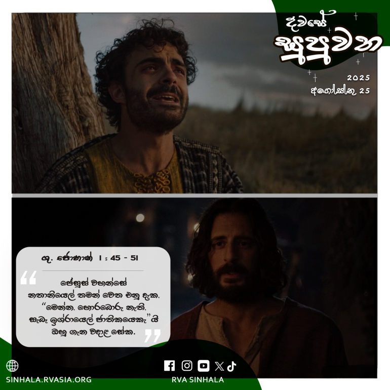 45 පිලිප් ද නතානියෙල් සොයා ගෙන, ”මෝසෙස් ව්යවස්ථාවලියෙහි හා දිවැසාවලියෙහි සඳහන් කර ඇති තැනැන් වහන්සේ, එනම්, ජෝසෙප්ගේ පුත් නාසරෙත්හි ජේසුස් වහන්සේ අපට හමු වූ සේකැ”යි කී ය. 46 නතානියෙල් ද කතා කරමින්, ”වැදගැම්මක් ඇති කිසිවක් නාසරෙතින් නික්මේ දැ”යි ඇසී ය. ”ඇවිත් බලන්නැ”යි පිලිප් කී ය. 47 ජේසුස් වහන්සේ නතානියෙල් තමන් වෙත එනු දැක, ”මෙන්න, හොරබොරු නැති, සැබෑ ඉශ්රායෙල් ජාතිකයෙකැ”යි ඔහු ගැන වදාළ සේක. 48 ”ඔබ මා ගැන කෙසේ දන්නෙහි දැ”යි නතානියෙල් උන් වහන්සේගෙන් ඇසී ය. ජේසුස් වහන්සේ පිළිතුරු දෙමින්, ”පිලිප් ඔබ කැඳවන්නටත් පෙර, අත්තික්කා ගස යට ඔබ සිටිනු මම දිටිමි”යි වදාළ සේක. 49 නතානියෙල් උත්තර දෙමින්, ”ගුරුදේවයෙනි, ඔබ වහන්සේ නම්, දෙවියන් වහන්සේගේ පුත්රයාණෝ ය; ඔබ වහන්සේ නම්, ඉශ්රායෙල්හි රජිඳාණෝ ය”යි කී ය. 50 ජේසුස් වහන්සේ ද පිළිතුරු දෙමින්, ”ඔබ අත්තික්කා ගස යට සිටිනු මම දිටිමි, යි මා ඔබට වදාළ බැවින් ද, ඔබ අදහා ගත්තේ? මීට වඩා මහත් දේ ඔබ දකින්නෙහි ය”යි වදාළ සේක. 51 තවදුරටත් උන් වහන්සේ කතා කරමින්, ”ඒකාන්තයෙන් මම ඔබට කියමි; ස්වර්ගය විවර වී, මනුෂ්ය-පුත්රයාණන් වෙත දෙවියන් වහන්සේගේ දූතයන් නැඟ යනවාත්, බැස එනවාත් ඔබ දකින්නෙහි ය”යි වදාළ සේක.
