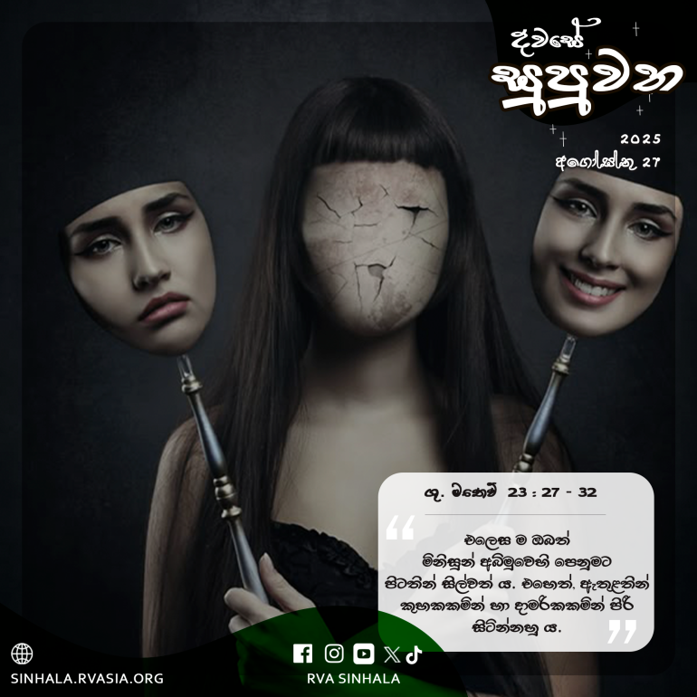 27 ”විනයධරයෙනි, පරිසිවරුනි, කෛරාටිකයන් වූ ඔබට වන විපතක මහත! මන්ද, ඔබ හුණු ගා සුදු කළ සොහොන්වලට සමාන ය. ඒවා පිටතින් ශෝභන ව පෙනෙතත් ඇතුළත මළවුන්ගේ ඇටකටුවලින් ද සියලු ආකාර කැලිකසළින් ද පිරී තිබේ. 28 එලෙස ම ඔබත් මිනිසුන් අබිමුවෙහි පෙනුමට පිටතින් සිල්වත් ය. එහෙත්, ඇතුළතින් කුහකකමින් හා දාමරිකකමින් පිරී සිටින්නහු ය.