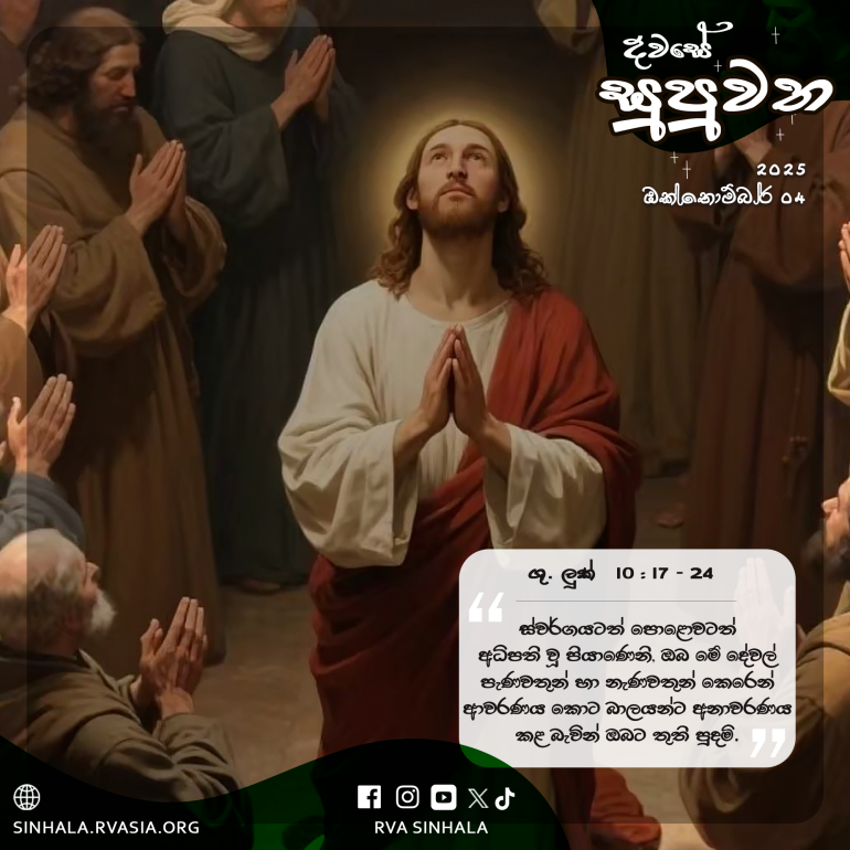 21 ඒ පැයේ දී ම උන් වහන්සේ ශුද්ධාත්මයෙන් පූර්ණ වී උදන් අනමින්, ”ස්වර්ගයටත් පොළොවටත් අධිපති වූ පියාණෙනි, ඔබ මේ දේවල් පැණවතුන් හා නැණවතුන් කෙරෙන් ආවරණය කොට බාලයන්ට අනාවරණය කළ බැවින් ඔබට තුති පුදමි. එසේය පියාණෙනි, ඔබට ප්රිය මනාප වූයේත් එය ම ය. 22 මාගේ පියාණන් වහන්සේ සියල්ල ම මට පවරා දී තිබේ. පුත්රයාණෝ කවරෙක් දැ යි පියාණන් වහන්සේ හැර අන් කිසිවෙක් නොදනිති. එසේ ම පුත්රයාණනුත්, පුත්රයාණන් විසින් පියාණන් වහන්සේ එළිදරව් කිරීමට තෝරාගනු ලැබූ අයත් හැර අන් කිසිවෙක් පියාණන් වහන්සේ කවරෙක් දැ යි නොදනිති”යි වදාළ සේක. 23 එවිට උන් වහන්සේ ශ්රාවකයන් සමඟ තනියම සිටිය දී ඔවුන්ට කතා කොට, ”ඔබ නරඹන දේ දකින ඇස් භාග්යවන්ත ය. 24 මෙය මම ඔබට කියමි, ඔබ දකින දේ දකින්ටත්, ඔබ අසන දේ අසන්ටත් බොහෝ දිවැසිවරු ද රජවරු ද අපේක්ෂාවෙන් සිටියහ. එහෙත් ඔවුන් එය දුටුවේ වත් නැත, ඇසුවේ වත් නැතැ”යි වදාළ සේක.
