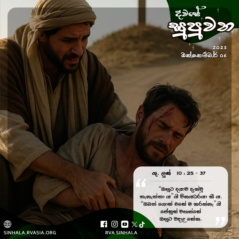 25 එක්තරා විනයධරයෙක් නැඟිට, උන් වහන්සේ පරීක්ෂා කරමින් ”ගුරුදේවයෙනි, සදාතන ජීවනය හිමි කරගනු සඳහා මා කුමක් කටයුතු දැ”යි ඇසී ය. 26 උන් වහන්සේ ද ඔහුට පිළිතුරු දෙමින්, ”ව්යවස්ථාවලියෙහි ලියා ඇත්තේ කිමෙක් ද? ඔබ එය තේරුම්ගන්නේ කෙසේ දැ”යි ඇසූ සේක. 27 ඔහු උත්තර දෙමින්, ”නුඹේ මුළු හෘදයෙන් ද නුඹේ මුළු ආත්මයෙන් ද නුඹේ මුළු වීර්යයෙන් ද නුඹේ මුළු බුද්ධියෙන් ද නුඹේ දෙවි වූ සමිඳාණන් වහන්සේටත්, නුඹ නුඹට ප්රේම කරන්නාක් මෙන් නුඹේ අසල්වැසියාටත් ප්රේම කරන්න යනුයි” කී ය. 28 උන් වහන්සේ, ”ඔබේ උත්තරය හරි ය. එසේ කරන්න, එවිට ඔබ ජීවත් වන්නෙහි ය”යි ඔහුට වදාළ සේක. 29 එහෙත් ඔහු තමන් නිවැරදි බව දක්වන්ට කැමැති ව ”මාගේ අසල්වැසියා කවරෙක් දැ”යි ජේසුස් වහන්සේගෙන් ප්රශ්න කෙළේ ය.