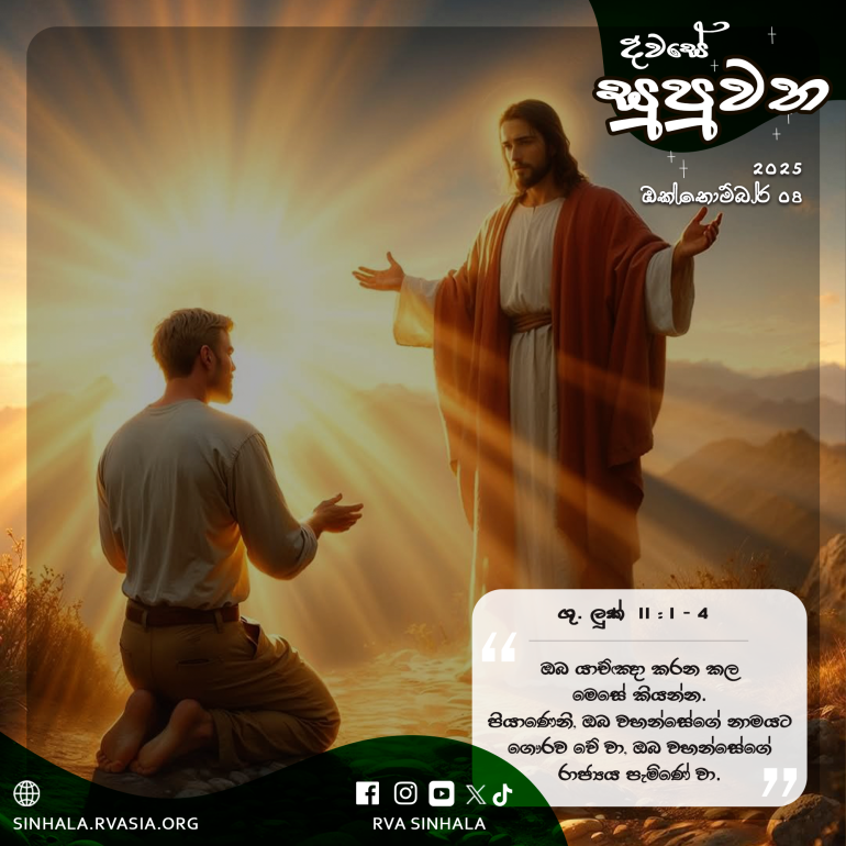 1 උන් වහන්සේ එක් තැනක යාච්ඤා කරමින් සිටි සේක. එය නිම වූ පසු උන් වහන්සේගේ ශ්රාවකයන්ගෙන් එක් තැනැත්තෙක් කතා කොට, ”ස්වාමීනි, ජොහන් තම ගෝලයන්ට ඉගැන්වූ ලෙස, අපටත් යාච්ඤා කරන්නට ඉගැන්නුව මැනවැ”යි කීවේ ය. 2 උන් වහන්සේ ඔවුන්ට මෙසේ වදාළ සේක: ”ඔබ යාච්ඤා කරන කල මෙසේ කියන්න: