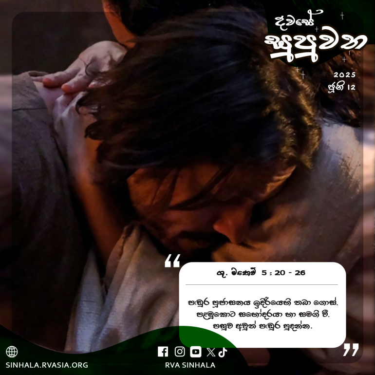 21 ” ‘මිනී නොමරන්න; මිනී මරන කවරෙකු වුව ද විනිශ්චයට යටත් වනු ඇතැ’යි පැරැන්නන්ට කී බව ඔබ අසා ඇත. 22 එහෙත්, මම ඔබට කියමි, තමාගේ සහෝදරයා සමඟb කෝප වන කවරෙකු වුව ද ඔහු අධිකරණයට යටත් වනු ඇත. තමාගේ සහෝදරයාට ‘මෝඩයා’ කියා ගරහන කවරෙකු වුව ද ඔහු ශ්රේෂ්ඨාධිකරණයට යටත් වනු ඇත; ‘ජඩයා’ කියා ගරහන කවරෙකු වුව ද ඔහු නිරා ගින්නට ගොදුරු වනු ඇත. 23 එබැවින් ඔබ පූජාසනය වෙත පඬුරක් ගෙනෙන කල, ඔබේ සහෝදරයා ඔබට විරුද්ධ ව යම් කිසි අමනාපයක් ඇති ව සිටින බව එහි දී සිහි වී නම්, 24 පඬුර පූජාසනය ඉදිරියෙහි තබා ගොස්, පළමුකොට සහෝදරයා හා සමගි වී, පසුව අවුත් පඬුර පුදන්න.