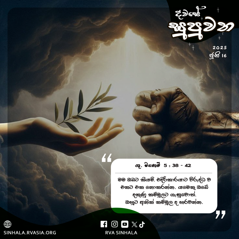 38 ” ‘ඇසට ඇස ය, දතට දත ය’ යන කීම ඔබ අසා ඇත. 39 එහෙත්, මම ඔබට කියමි, එදිරිකාරයාට විරුද්ධ ව එකට එක නොකරන්න. යමෙකු ඔබේ දකුණු කම්මුලට ගැසුවොත්, ඔහුට අනික් කම්මුල ද හරවන්න. 40 යමෙකු නඩු කියා ඔබේ කමිසය ගන්න කැමැති වුවොත්, ඔහුට ඔබේ කබායත් ගන්න අවසර දෙන්න.