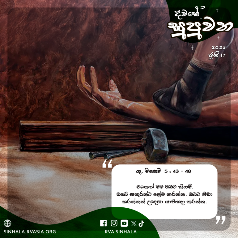 43 ” ‘නුඹේ අසල්වැසියාට ප්රේම කරන්න, සතුරාට වෛර කරන්නැ’යි කී බව ඔබ අසා ඇත. 44 එහෙත් මම ඔබට කියමි, ඔබේ සතුරන්ට ප්රේම කරන්න; ඔබට පීඩා කරන්නන් උදෙසා යාච්ඤා කරන්න. 45 මෙසේ ඔබ ස්වර්ගයෙහි වැඩ සිටින ඔබේ පියාණන් වහන්සේගේ පුත්රයෝ වන්නහු ය. කුමක් නිසා ද, උන් වහන්සේ දුදනන් හට හා සුදනන් හට තම හිරු එළිය උදා කරවන සේක; දමිටුන් හට හා අදමිටුන් හට වැසි වස්වන සේක. 46 ඔබට ප්රේම කරන්නන්ට පමණක් ඔබ ප්රේම කරන්නහු නම්, එයින් ඇති විපාකය කුමක් ද? අයකැමියෝ පවා එසේ නොකරත් ද? 47 ඔබේ සහෝදරයන්ට පමණක් ඔබ ආචාර කරන්නහු නම්, එහි ඇති විශේෂය කුමක් ද? විජාතිකයෝ පවා එසේ නොකරත් ද? 48 එබැවින් ඔබේ ස්වර්ගීය පියාණන් වහන්සේ සර්ව සම්පූර්ණ ව සිටින්නාක් මෙන් ඔබ ද සර්ව සම්පූර්ණ වන්න.”