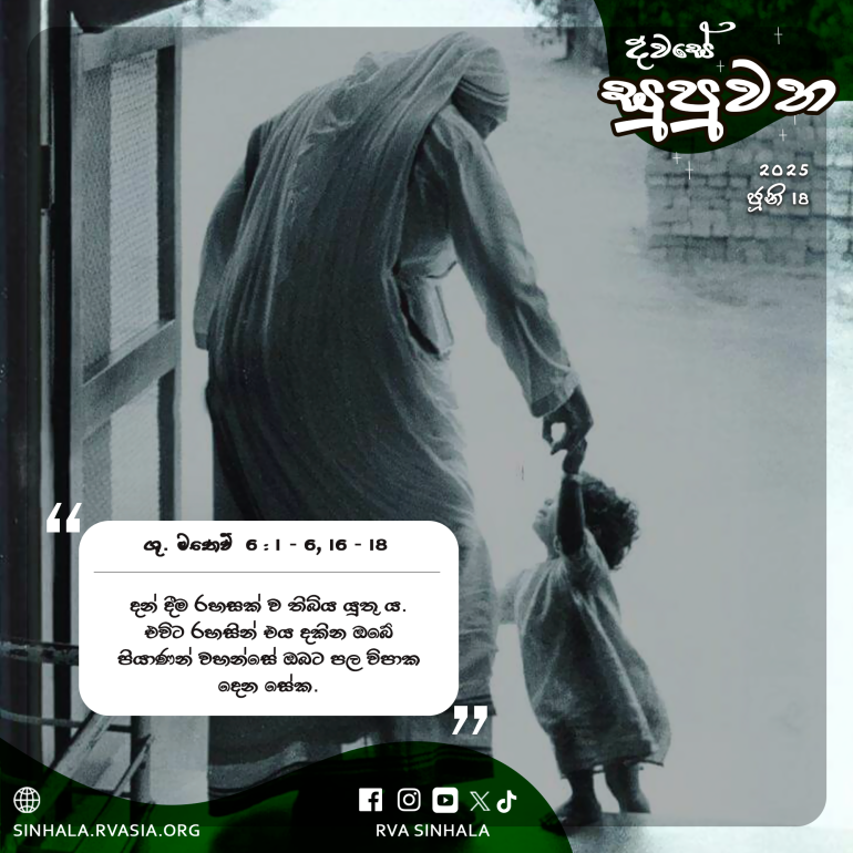 1 ”මිනිසුන්ට පෙනෙන පිණිස ලෝකයා ඉදිරියෙහි ඔබේ පුණ්ය ක්රියා නොකරන්න බලාගන්න. එසේ කළහොත්, ස්වර්ගයෙහි වැඩ වසන ඔබේ පියාණන් වහන්සේගෙන් කිසි විපාකයක් ඔබට නොලැබෙන්නේ ය.