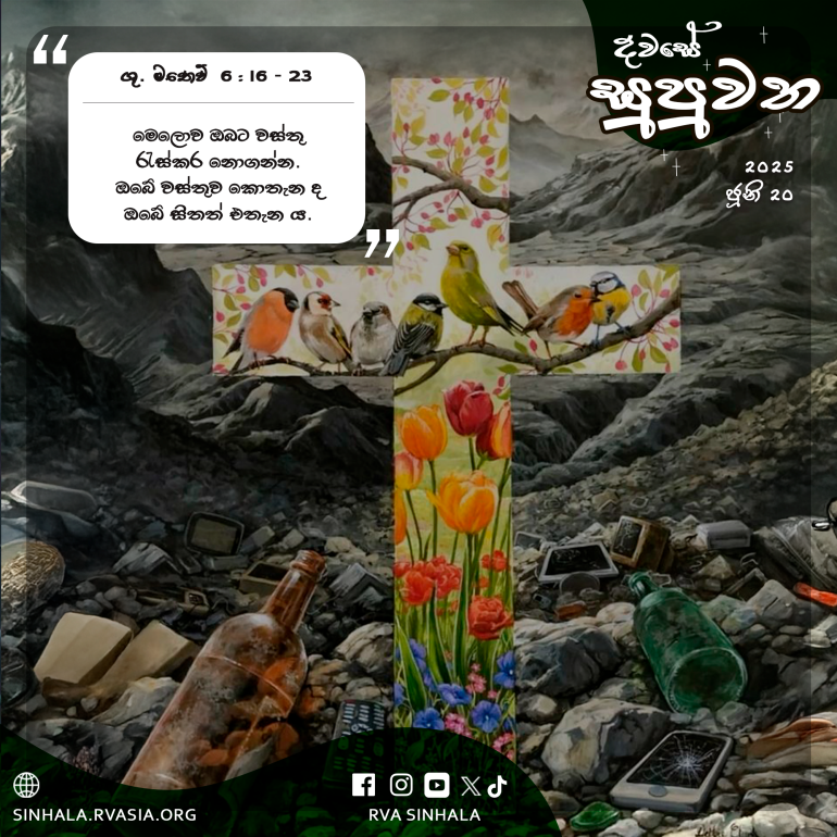 19 ”මෙලොව ඔබට වස්තු රැස්කර නොගන්න. මලකඩ ද කාවෝ ද ඒවා කාදමති. සොරු ද උමං කැණ ඒවා සොරාගනිති. 20 එහෙත්, ස්වර්ගයෙහි ඔබට වස්තු රැස්කරගන්න. එහි දී මලකඩ වත් කාවෝ වත් ඒවා නාස්ති නොකරති. සොරු ද උමං කැණ ඒවා සොරා නොගනිති. 21 ඔබේ වස්තුව කොතැන ද ඔබේ සිතත් එතැන ය.”