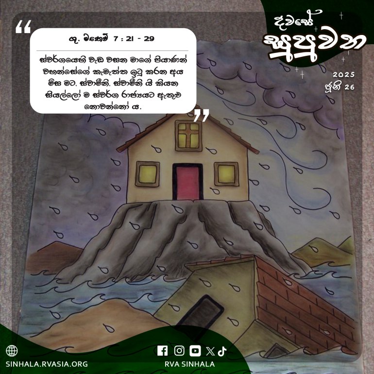 24 ”එහෙයින් යමෙක් මාගේ වචන අසා, ඒවා පිළිපදී ද, ඔහු පර්වතය මත තමාගේ ගෙය තනාගත් නැණවතෙකුට සමාන ය. 25 වැසි වැස, ජලය ගලා, සුළඟ හමා ඒ ගෙට ගැසී ය, එය පර්වතය මත පිහිටි බැවින් බිඳ නොවැටිණි. 26 තවද, යමෙක් මාගේ මේ වචන අසා, ඒවා නොපිළිපදී ද, ඔහු වැලි මත ගෙය තනාගත් අනුවණ මනුෂ්යයෙකුට සමාන ය. 27 වැසි වැස, ජලය ගලා, සුළඟ හමා ඒ ගෙට ගැසී ය, එය බිඳ වැටිණි. එහි වැටීම ද භයංකර විය.”