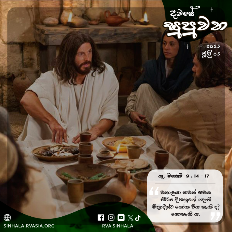 14 එකල ජොහන්ගේ ගෝලයෝ උන් වහන්සේ වෙත අවුත්, ”පරිසිවරුත්, අපිත් නිතර උපවාස කරමු. එහෙත්, ඔබේ ශ්රාවකයන් උපවාස නොකරන්නේ මන්දැ”යි ඇසූ හ. 15 ජේසුස් වහන්සේ ඔවුන්ට කතා කොට මෙසේ වදාළ සේක: ”මනාලයා තමන් සමඟ සිටිය දී ඔහුගේ ඥාතිමිත්රාදීන්ට ශෝක විය හැකි ද? නොහැකි ය. එහෙත්, මනාලයා ඔවුන් කෙරෙන් වෙන් කරනු ලබන දවසක් පැමිණේ. ඔවුන් ඒ දවසේ දී උපවාස කරනු ඇත.