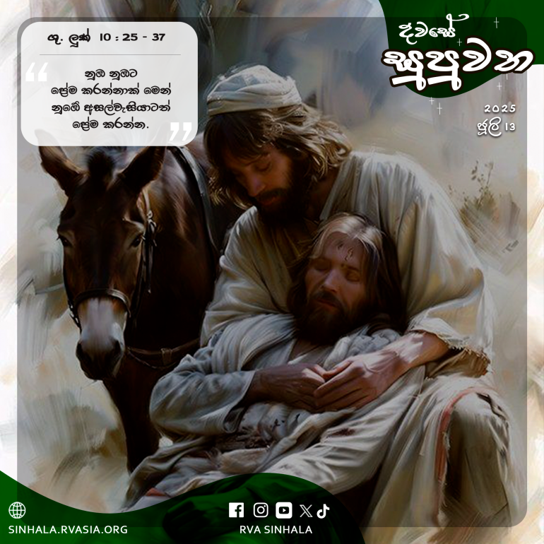 25 එක්තරා විනයධරයෙක් නැඟිට, උන් වහන්සේ පරීක්ෂා කරමින් ”ගුරුදේවයෙනි, සදාතන ජීවනය හිමි කරගනු සඳහා මා කුමක් කටයුතු දැ”යි ඇසී ය. 26 උන් වහන්සේ ද ඔහුට පිළිතුරු දෙමින්, ”ව්යවස්ථාවලියෙහි ලියා ඇත්තේ කිමෙක් ද? ඔබ එය තේරුම්ගන්නේ කෙසේ දැ”යි ඇසූ සේක. 27 ඔහු උත්තර දෙමින්, ”නුඹේ මුළු හෘදයෙන් ද නුඹේ මුළු ආත්මයෙන් ද නුඹේ මුළු වීර්යයෙන් ද නුඹේ මුළු බුද්ධියෙන් ද නුඹේ දෙවි වූ සමිඳාණන් වහන්සේටත්, නුඹ නුඹට ප්රේම කරන්නාක් මෙන් නුඹේ අසල්වැසියාටත් ප්රේම කරන්න යනුයි” කී ය. 28 උන් වහන්සේ, ”ඔබේ උත්තරය හරි ය. එසේ කරන්න, එවිට ඔබ ජීවත් වන්නෙහි ය”යි ඔහුට වදාළ සේක. 29 එහෙත් ඔහු තමන් නිවැරදි බව දක්වන්ට කැමැති ව ”මාගේ අසල්වැසියා කවරෙක් දැ”යි ජේසුස් වහන්සේගෙන් ප්රශ්න කෙළේ ය.