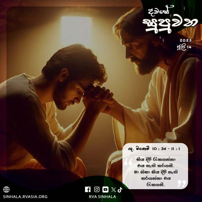 34 ”මම මිහි පිට සාමය දෙන පිණිස ආවෙමි යි නොසිතන්න; සාමය නොව කඩුවක් දෙන පිණිස ආවෙමි. 35 මන්ද, තම පුතා පියා සමඟ ද, දුව සිය මවු සමඟ ද, ලේලී සිය නැන්දම්මා සමඟ ද, භේද කරවන පිණිස ආවෙමි. 36 මිනිසෙකුගේ සතුරෝ නම් ඔහුගේ ම ගෙදර වැසියෝ ය. 37 මට වඩා පියාට වත්, මවුට වත් ප්රේම කරන්නා මට සුදුසු නො වේ. මට වඩා පුතාට වත්, දුවට වත් ප්රේම කරන්නා මට සුදුසු නො වේ. 38 සිය කුරුසිය දරා ගෙන මා අනුගමනය නොකරන තැනැත්තා මට සුදුසු නො වේ. 39 සිය දිවි රැකගන්නා එය නැති කරගනී. මා නිසා සිය දිවි නැති කරගන්නා එය රැකගනී.”