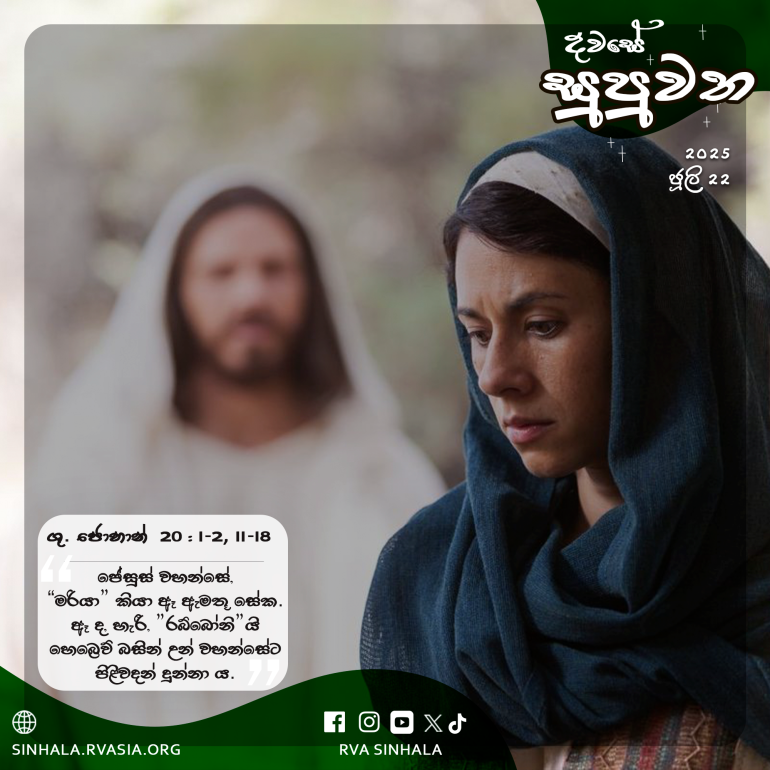 14 මෙසේ කියමින් ඈ ආපසු හැරෙද්දී, ජේසුස් වහන්සේ එහි සිටින බව දුටුවා ය. එහෙත් ඒ ජේසුස් වහන්සේ බව ඈ නොදත්තී ය. 15 ”ස්ත්රිය, ඔබ හඬන්නේ මන් ද? ඔබ කවරෙකු සොයන්නෙහි දැ”යි ජේසුස් වහන්සේ ඇගෙන් ඇසූ සේක. ඈ උන් වහන්සේ උයන්ගොව්වා යයි සිතා: ”මහතාණෙනි, ඔබ උන් වහන්සේ ගෙන ගියා නම්, උන් වහන්සේ කොතැන තැන්පත් කෙළෙහි දැ යි මට කිව මැනව; මම උන් වහන්සේ රැගෙන යමි”යි කීවා ය. 16 ජේසුස් වහන්සේ, ”මරියා” කියා ඈ ඇමතූ සේක. ඈ ද, හැරී, ”රබ්බෝනි”යි හෙබ්රෙව් බසින් උන් වහන්සේට පිළිවදන් දුන්නා ය. එහි අර්ථය ‘ගුරුදේවයෙනි’ යනුයි.
