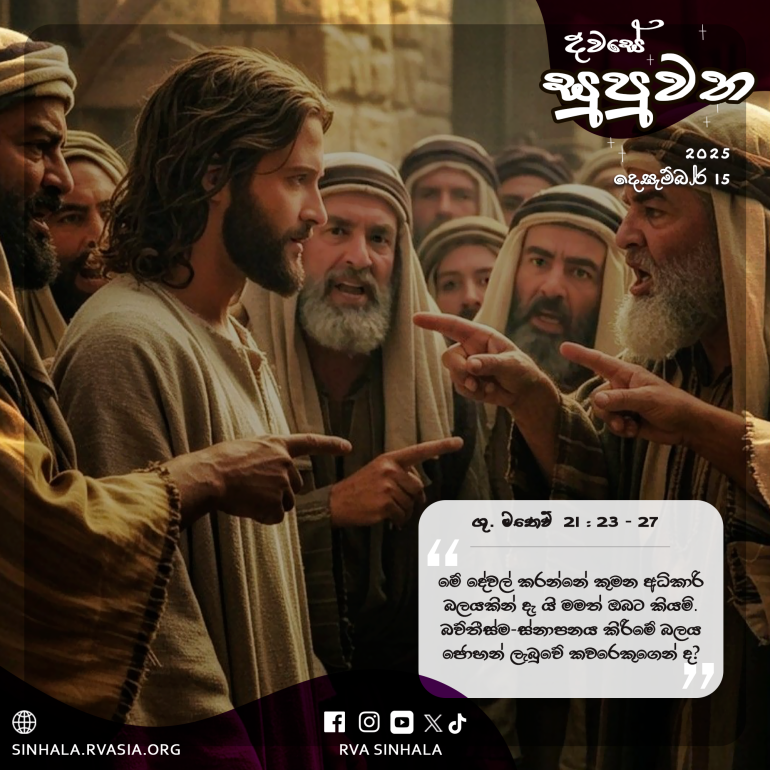 23 උන් වහන්සේ දේව මාලිගාවට ඇතුළු ව උගන්වමින් සිටිය දී නායක පූජකවරු ද ප්රජා මූලිකයෝ ද උන් වහන්සේ වෙතට අවුත්, ”ඔබ මේ දේ කරන්නේ කුමන අධිකාරි බලයකින් ද? මේ බලය ඔබට පැවරුවේ කවරෙක් දැ”යි ප්රශ්න කළහ. 24 ජේසුස් වහන්සේ උත්තර දෙමින්, ”මමත් ඔබගෙන් ප්රශ්නයක් විචාරමි. ඔබ එය මට කියන්නහු නම්, මේ දේවල් කරන්නේ කුමන අධිකාරි බලයකින් දැ යි මමත් ඔබට කියමි. 25 බව්තීස්ම-ස්නාපනය කිරීමේ බලය ජොහන් ලැබුවේ කවරෙකුගෙන් ද? දෙවියන් වහන්සේගෙන් ද? නොහොත් මනුෂ්යයන්ගෙන් දැ”යි ඇසූ සේක. ඔව්හු තම තමන් අතර තර්ක කරමින්, ” ‘දෙවියන් වහන්සේගෙන් ය’යි කීවොත්, ‘එසේ නම් ඔබ ජොහන් විශ්වාස නොකෙළේ මන්දැ’යි අපෙන් අසනු ඇත. 26 ‘මනුෂ්යයන්ගෙන් ය’යි කීවොත්, ජොහන් දිවැසිවරයෙකු බව සියලු දෙනාම පිළිගෙන ඇති හෙයින් සමූහයාට මුහුණ දීමට අපට නො හැකිවනු ඇත” යනුවෙන් තම තමන් අතර තර්ක කරමින් සිට, බියෙන්, ”අපි නොදනිමු”යි ජේසුස් වහන්සේට උත්තර දුන්හ. 27 උන් වහන්සේ කතා කරමින්, ”කවර අධිකාරි බලයකින් මම මේ දේවල් කරම් දැ යි මමත් ඔබට නොකියමි”යි ඔවුන්ට වදාළ සේක.