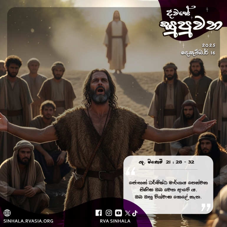 28 තවදුරටත් ජේසුස් වහන්සේ කතා කරමින්, ”ඔබ මේ ගැන කුමක් සිතන්නහු ද? එක් මිනිසෙකුට පුත්රයෝ දෙදෙනෙක් සිටියහ; ඔහු වැඩිමලා ළඟට ගොස්, ‘දරුවා යන්න; අද මිදි වත්තේ වැඩ කරන්නැ’යි කී ය. 29 ඔහු උත්තර දෙමින්, ‘නොයමි’යි කී ය. එහෙත්, පසුව පසුතැවිලි වී වැඩට ගියේ ය. 30 පියා දෙවැන්නා ළඟට ගොස් ඔහුටත් මුලින් කී දේ ම කී ය. ඔහු උත්තර දෙමින්, ‘ස්වාමීනි, යමි’යි කී ය, එහෙත් නොගියේ ය. 31 ඒ දෙදෙනාගෙන් පියාගේ කැමැත්ත ඉටු කෙළේ කවරෙක් දැ”යි ඇසූ සේක. ”වැඩිමලා”යි ඔව්හු කී හ. ජේසුස් වහන්සේ ඔවුන්ට කතා කොට, ”සැබැවින් ම මම ඔබට කියමි, අයකැමියෝත්, වෙසඟනෝත් ඔබට පළමුවෙන් දෙවියන් වහන්සේගේ රාජ්යයට පැමිණෙති. 32 මන්ද, ජොහන් ධර්මිෂ්ඨ මාර්ගය පෙන්වන පිණිස ඔබ වෙත ආවේ ය. ඔබ ඔහු විශ්වාස කෙළේ නැත. එහෙත්, අයකැමියෝත් වෙසඟනෝත් ඔහු විශ්වාස කළහ. ඔබ එය දැක ඉන්පසුව වත් ඔහු කෙරෙහි විශ්වාස කරන පිණිස පසුතැවී සිත් හරවා නොගත්තහු ය”යි වදාළ සේක.