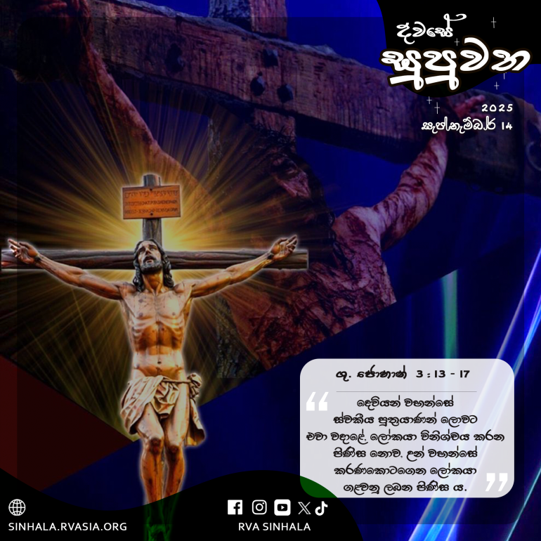 16 ”දෙවියන් වහන්සේ ලෝකයාට කොතරම් ප්‍රේම කළ සේක් ද කීවොත්, ස්වකීය ඒක ජාතක පුත්‍රයාණන් වුව ද ලොවට දෙවා වදාළ සේක. එසේ කෙළේ, උන් වහන්සේ කෙරෙහි අදහන සියලු දෙනා ම විනාශ නොවී සදාතන ජීවනය ලබන පිණිස ය. 17 දෙවියන් වහන්සේ ස්වකීය පුත්‍රයාණන් ලොවට එවා වදාළේ, ලෝකයා විනිශ්චය කරන පිණිස නොව, උන් වහන්සේ කරණකොටගෙන ලෝකයා ගළවනු ලබන පිණිස ය.