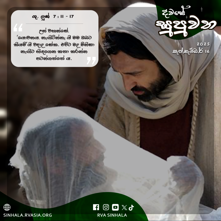 11 ඉන්පසු ජේසුස් වහන්සේ නායින් නම් නුවරකට වැඩිය සේක. උන් වහන්සේගේ ශ්රාවකයෝ ද මහත් සමූහයක් ද උන් වහන්සේ පිරිවරා ගියහ. 12 උන් වහන්සේ නුවර දොරටුවට ළං වූ කල, මළ මිනියක් පිටතට ගෙනෙන ලද්දේ ය. මළ තැනැත්තේ, සිය මවගේ එක ම පුත්රයා ය. ඈ ද වැන්දඹුවකි. නුවරවාසී විශාල පිරිසක් ඈ සමඟ ආහ. 13 සමිඳාණන් වහන්සේ ඈ දැක අනුකම්පා කොට, ”හැඬීම නවත්වන්නැ”යි වදාළ සේක. 14 උන් වහන්සේ ළං වී දෙණට අත තැබූ සේක. එවිට දෙණ උසුලන්නෝ නැවතුණාහ. උන් වහන්සේ, ”යෞවනය, නැඟිටින්නැ යි මම ඔබට කියමි”යි වදාළ සේක. 15 එවිට මළ මිනිසා නැඟිට හිඳගෙන කතා කරන්න පටන්ගත්තේ ය. උන් වහන්සේ ඔහු සිය මෑණියන්ට භාර දුන් සේක. 16 එකල සියල්ලෝ ම බිය පත් ව, ”ශ්රේෂ්ඨ දිවැසිවරයෙක් අප අතර පහළ වී සිටියි. දෙවියන් වහන්සේ සිය සෙනඟ ගළවන්න වැඩිය සේකැ”යි කියමින් දෙවියන් වහන්සේට ප්රශංසා කළහ. 17 උන් වහන්සේ ගැන මේ පුවත මුළු ජුදයෙහි ද අවට පෙදෙස්වල ද පැතිර ගියේ ය.