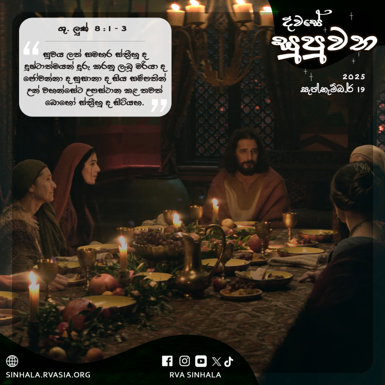 1 ඉන්පසු ජේසුස් වහන්සේ ධර්ම දේශනා කරමින් ද දෙවියන් වහන්සේගේ රාජ්යය පිළිබඳ සුබ අස්න ප්රකාශ කරමින් ද නගර සහ ගම්වල සැරිසැරූ සේක. උන් වහන්සේ සමඟ ශ්රාවකයෝ දොළොස්දෙනා ද 2 අශුද්ධාත්ම කෙරෙන් හා ලෙඩ රෝගවලින් සුවය ලත් සමහර ස්ත්රීහු ද තමන් කෙරෙන් දුෂ්ටාත්මයන් හත් දෙනෙකු දුරු කරනු ලැබූ මග්දලේනා නම් ලත් මරියා ද 3 හෙරොද්ගේ භාණ්ඩාගාරික වන කුසාගේ භාර්යාව වන ජෝවන්නා ද සුසානා ද සිය සම්පතින් උන් වහන්සේට උපස්ථාන කළ තවත් බොහෝ ස්ත්රීහු ද සිටියහ.