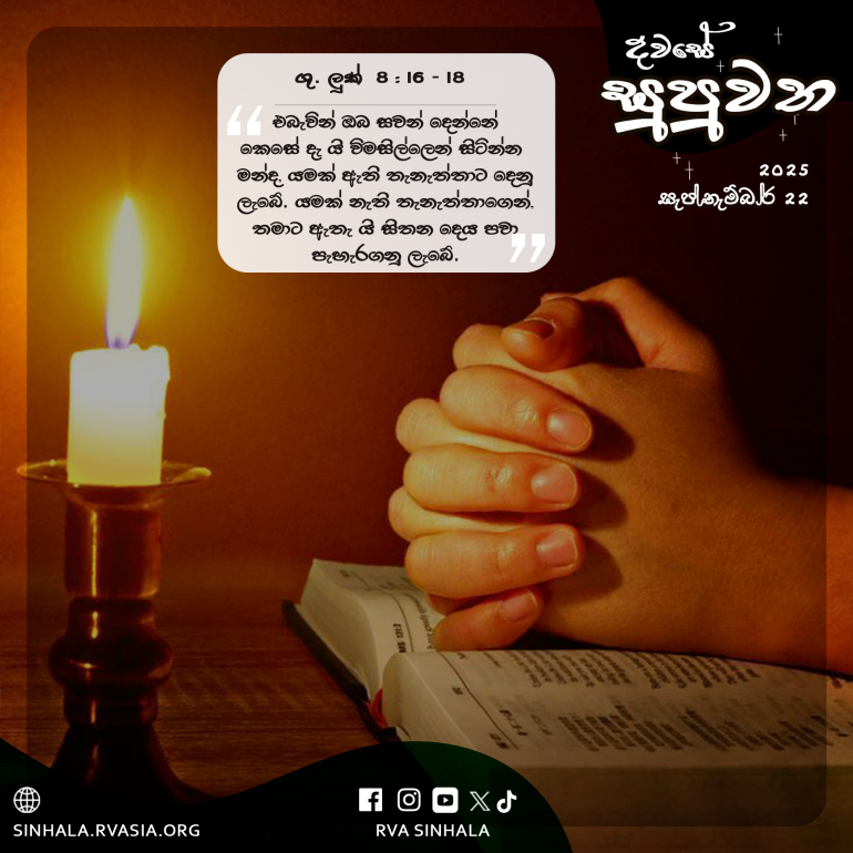 16 ”කිසිවෙකු පහනක් දල්වා බඳුනකින් වසන්නේ වත් යහනක් යට තබන්නේ වත් නැත; එහෙත්, ඇතුළු වන්නන්ට එළිය පෙනෙන පිණිස පහන්රුක උඩ තබති. 17 ඒ නිසා හෙළි කරනු නොලබන සැඟවුණු දෙයක් නැත; නොහොත් ප්රකාශයට පත් නොවන, හෙළි නොවන කිසි රහසක් ද නැත. 18 එබැවින් ඔබ සවන් දෙන්නේ කෙසේ දැ යි විමසිල්ලෙන් සිටින්න. මන්ද, යමක් ඇති තැනැත්තාට දෙනු ලැබේ; යමක් නැති තැනැත්තාගෙන්, තමාට ඇතැ යි සිතන දෙය පවා පැහැරගනු ලැබේ.”