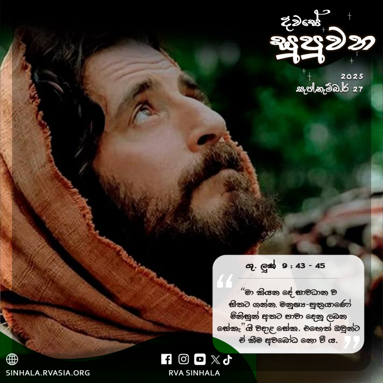 උන් වහන්සේ සිදු කළ සියල්ල ගැන හැම දෙනා ම පුදුම ව සිටිය දී, උන් වහන්සේ සිය ශ්රාවකයන්ට කතා කොට, 44 ”මා කියන දේ සාවධාන ව සිතට ගන්න, මනුෂ්ය-පුත්රයාණෝ මිනිසුන් අතට පාවා දෙනු ලබන සේකැ”යි වදාළ සේක. 45 එහෙත් ඔවුන්ට ඒ කීම අවබෝධ නො වී ය. එය ඔවුන්ට නොවැටහෙන ලෙසින් සැඟවී තිබිණි. ඔව්හු ඒ කීම ගැන උන් වහන්සේගෙන් ඇසීමටත් බිය වූ හ.