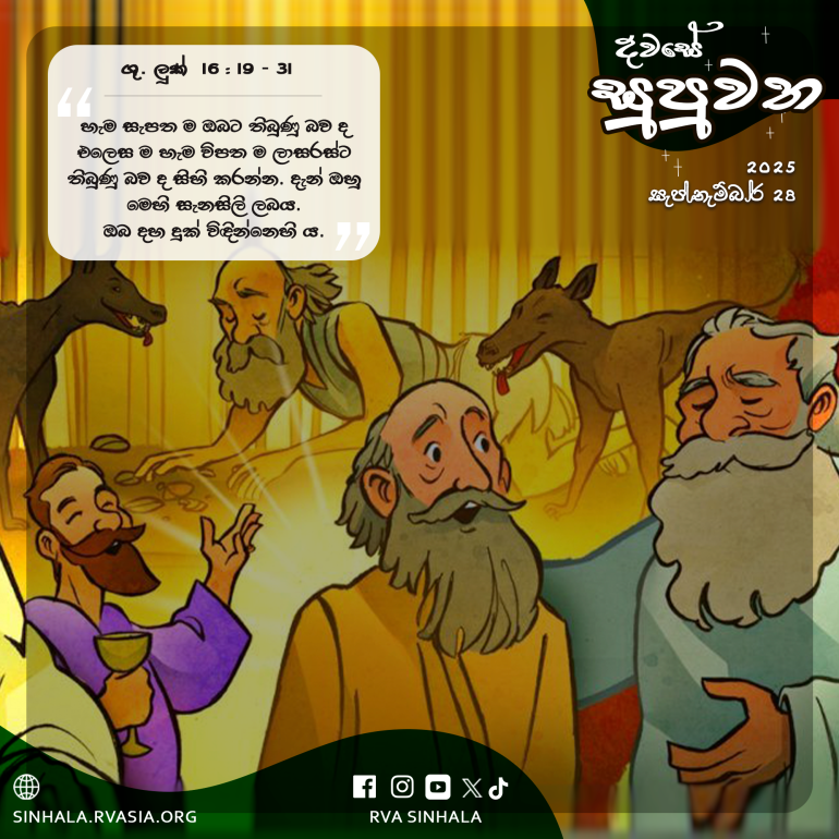 19 ”අගනා නීල-රක්ත වස්ත්ර හා සිනිඳු සේද රෙදි හැඳගත්, හැමදා සැප විහරණයෙන් කල් යැවූ එක් ධනපතියෙක් වී ය. 20 ඔහුගේ නිවසේ දොරටුව ළඟ ඇඟ පුරාම වණ තිබූ ලාසරස් නම් එක් හිඟන්නෙක් ගෙනවුත් තබන ලදී. 21 ඔහු ධනපතියාගේ කෑම මේසයෙන් වැටෙන කැබැලිවලින් වුව ද සාගිනි නිවා ගැනීමට සතුටු විය. බල්ලෝ පවා ඔහුගේ වණ ලෙව කෑවෝ ය. 22 ඒ හිඟන්නා මියගිය පසු දේව දූතයන් විසින් ඔහු ආබ්රහම් ළඟට ගෙන යන ලද්දේ ය. ධනපතියාත් මැරී භූමිදාන කරන ලද්දේ ය. 23 ඔහු ආත්ම භවනෙහි වධ විඳිමින් ඇස් ඔසවා ආබ්රහම් ද ඔහුගේ තුරුල්ලේ හුන් ලාසරස් ද දුරින් දැක, 24 මොරගසා, ‘ආබ්රහම් පිය තුමෙනි, මට කරුණා කොට, තම ඇඟිලි තුඩ දියේ ගල්වා, මාගේ දිව තෙමාලන පිණිස ලාසරස් එවනු මැනව: මන්ද, මම මේ ගිනි ජාලාවෙහි දහ දුක් විඳිමි’යි කී ය. 25 එහෙත් ආබ්රහම් පිළිතුරු දෙමින්, ‘පුත්රය, ඔබ ජීවත් ව සිටිය දී, හැම සැපත ම ඔබට තිබුණු බව ද එලෙස ම හැම විපත ම ලාසරස්ට තිබුණු බව ද සිහි කරන්න. එහෙත් දැන් ඔහු මෙහි සැනසිලි ලබයි; ඔබ දහ දුක් විඳින්නෙහි ය. 26 එපමණකුත් නොවේ. මොබින් ඔබ වෙත යාමට වත් ඔබින් අප වෙත ඒමට වත් කැමැති වූවන්ට එය කළ නොහැකි වන සේ ඔබ හා අප හා අතර පරතරයක් පිහිටුවා ඇතැ’යි කී ය. 27 එවිට ධනවතා, ‘එසේ නම් පිය තුමෙනි, මාගේ සහෝදරයෝ පස් දෙනෙක් සිටිති; 28 ඔවුන් ද මේ වධ වේදනා ඇති ස්ථානයට නොපැමිණෙන පිණිස, ඔවුන්ට අවවාද දෙන්නට ලාසරස් මාගේ පියාගේ ගෙදරට යවන මෙන් ඉල්ලමි’යි කී ය. 29 එහෙත්, ආබ්රහම් කතා කොට: ‘මෝසෙස් සහ දිවැසිවරයෝ ඔවුන්ට සිටිති. ඔව්හු ඔවුන්ට සවන් දෙත් වා’යි කී ය. 30 ඔහු කතා කොට, ‘එසේ නොවේ, ආබ්රහම් පිය තුමෙනි, මළවුන් කෙරෙන් එකකු ඔවුන් වෙත ගියොත් ඔවුන් පසුතැවී සිත් හරවා ගනු ඇතැ’යි කී ය. 31 ආබ්රහම් පිළිතුරු දෙමින්, ‘ඔව්හු මෝසෙස්ටත් දිවැසිවරයන්ටත් සවන් නොදෙත් නම්, මළවුන්ගෙන් උත්ථානයට පැමිණියෙකු වුව ද ඔව්හු විශ්වාස නොකරති’යි ඔහුට කී ය.”