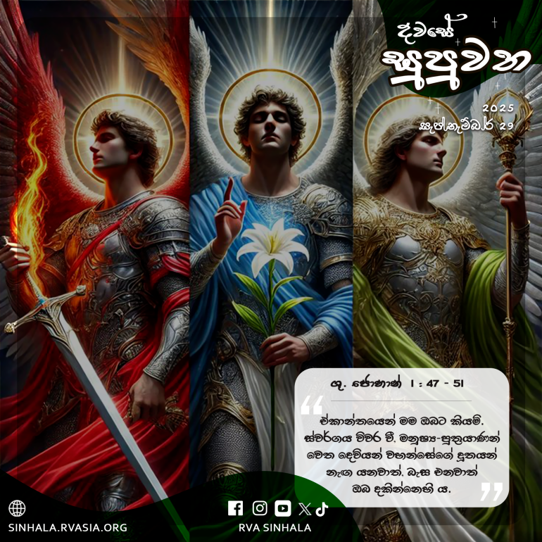 47 ජේසුස් වහන්සේ නතානියෙල් තමන් වෙත එනු දැක, ”මෙන්න, හොරබොරු නැති, සැබෑ ඉශ්රායෙල් ජාතිකයෙකැ”යි ඔහු ගැන වදාළ සේක. 48 ”ඔබ මා ගැන කෙසේ දන්නෙහි දැ”යි නතානියෙල් උන් වහන්සේගෙන් ඇසී ය. ජේසුස් වහන්සේ පිළිතුරු දෙමින්, ”පිලිප් ඔබ කැඳවන්නටත් පෙර, අත්තික්කා ගස යට ඔබ සිටිනු මම දිටිමි”යි වදාළ සේක. 49 නතානියෙල් උත්තර දෙමින්, ”ගුරුදේවයෙනි, ඔබ වහන්සේ නම්, දෙවියන් වහන්සේගේ පුත්රයාණෝ ය; ඔබ වහන්සේ නම්, ඉශ්රායෙල්හි රජිඳාණෝ ය”යි කී ය. 50 ජේසුස් වහන්සේ ද පිළිතුරු දෙමින්, ”ඔබ අත්තික්කා ගස යට සිටිනු මම දිටිමි, යි මා ඔබට වදාළ බැවින් ද, ඔබ අදහා ගත්තේ? මීට වඩා මහත් දේ ඔබ දකින්නෙහි ය”යි වදාළ සේක. 51 තවදුරටත් උන් වහන්සේ කතා කරමින්, ”ඒකාන්තයෙන් මම ඔබට කියමි; ස්වර්ගය විවර වී, මනුෂ්ය-පුත්රයාණන් වෙත දෙවියන් වහන්සේගේ දූතයන් නැඟ යනවාත්, බැස එනවාත් ඔබ දකින්නෙහි ය”යි වදාළ සේක.