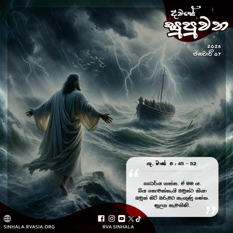 45 එකෙණෙහි ම උන් වහන්සේ සමූහයා විසුරුවා හැරිය සේක. සිය ශ්රාවකයන්ට ද ඔරුවට නැඟී තමන්ට පෙරටුව බෙත්සයිදාව බලා එගොඩට යන්න අණ දුන් සේක. 46 උන් වහන්සේ ඔවුන්ගෙන් වෙන් වූ පසු යාච්ඤා කරනු වස් කන්දට නැඟුණු සේක. 47 සවස් වූ කල ඔරුව මුහුද මැද විය. උන් වහන්සේ තනි ව ගොඩ සිටි සේක. 48 සුළඟ ඔවුන්ට විරුද්ධ ව හැමූ බැවින්, ඔවුන් ඔරු පැදීමෙන් වෙහෙසෙනු දුටු උන් වහන්සේ, රෑ සතර වැනි යාමයb පමණේ දී මුහුද පිට ඇවිදිමින් ම ඔවුන් වෙත අවුත් ඔවුන් පසු කර යන්න තැත් කළ සේක. 49 ඔව්හු උන් වහන්සේ මුහුද පිට ඇවිදිනු දැක, ”ඒ අවතාරයකැ”යි සිතා බියෙන් මොරගැසූ හ. 50 සියල්ලෝ ම උන් වහන්සේ දැක බිය වූ හ. එහෙත් උන් වහන්සේ එකෙණෙහි ම, ”ධෛර්ය ගන්න; ඒ මම ය; බිය නොවන්නැ”යි ඔවුන්ට කියා 51 ඔවුන් සිටි ඔරුවට නැඟුණු සේක. සුළඟ නැවතිණි. ඔව්හු විස්මයෙන් විස්මයට පත් වූ හ. 52 ඔවුන්ගේ මනස අඳුරු වී තිබිණි. මක්නිසා ද රොටි පිළිබඳ සිද්ධිය ඔවුන්ට අවබෝධ නොවූ බැවිනි.