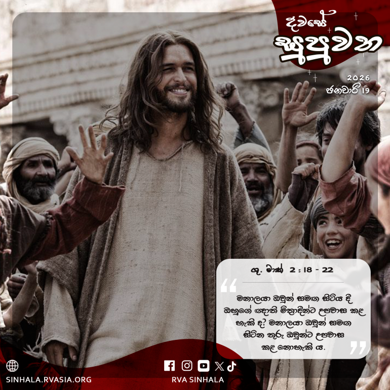 19 උන් වහන්සේ ඔවුන් අමතා මෙසේ වදාළ සේක: ”මනාලයා ඔවුන් සමඟ සිටිය දී ඔහුගේ ඥාති මිත්රාදීන්ට උපවාස කළ හැකි ද? මනාලයා ඔවුන් සමඟ සිටින තුරු ඔවුන්ට උපවාස කළ නොහැකි ය. 20 එහෙත්, මනාලයා ඔවුන් කෙරෙන් වෙන් කරනු ලබන දවසක් පැමිණෙයි. ඒ දවසේ දී ඔවුන් උපවාස කරනු ඇත. 21 තාන් රෙදි කඩකින් පරණ වස්ත්රයකට අණ්ඩයක් දමන කිසිවෙක් නැත, එසේ කළොත්, අලුත් රෙදි කඩට පරණ රෙද්ද ඇදී ඉරුම වඩා ලොකු වේ. 22 අලුත් මිදියුස පැරණි සම් බඳුන්වල වක්කරන කිසිවෙක් නැත. එසේ කළොත්, මිදියුසින් සම් බඳුන් පැළී, මිදියුසත් බඳුනුත් දෙක ම නැති වේ. නව මිදියුස දැමිය යුත්තේ නව බඳුන්වලට ම ය.”