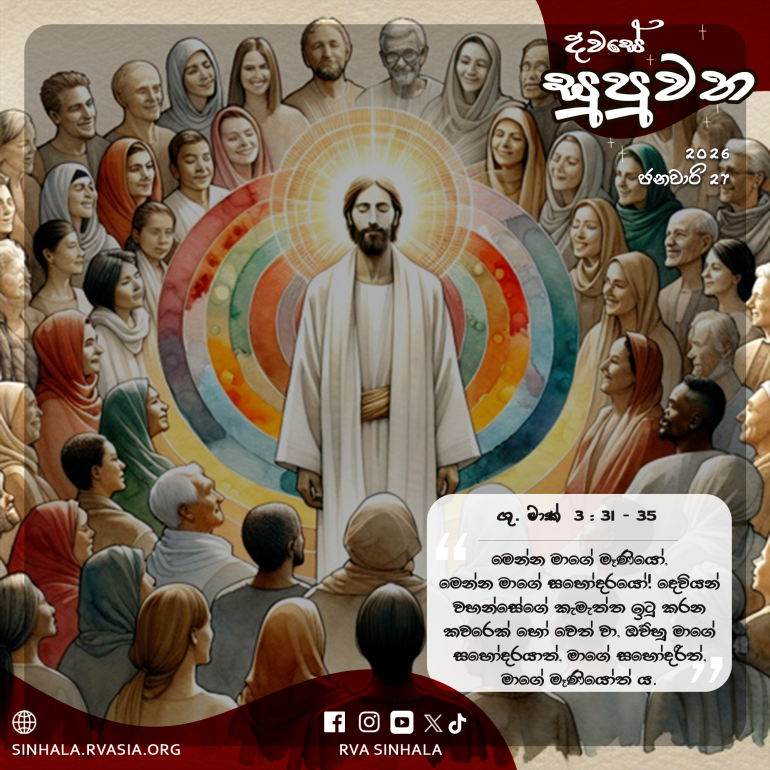31 එවිට උන් වහන්සේගේ මෑණියෝ ද සහෝදරයෝ ද අවුත් පිටත සිට, උන් වහන්සේ කැඳවා පණිවුඩයක් යැවූ හ. 32 සමූහයක් උන් වහන්සේ අවට වාඩි වී උන්හ. ඔව්හු, ”අන්න, ඔබේ මෑණියෝත්, සහෝදරයෝත්, සහෝදරියෝත් පිටත සිට ඔබ සොයති”යි උන් වහන්සේට කී හ. 33 උන් වහන්සේ උත්තර දෙමින්, ”මාගේ මෑණියෝත්, මාගේ සහෝදරයෝත් කවුරු ද” කියා පෙන්වමින්, 34 තමන් පිරිවරා අවට වාඩි වී සිටියවුන් දෙස වටේට බලා, ”මෙන්න මාගේ මෑණියෝ, මෙන්න මාගේ සහෝදරයෝ! 35 දෙවියන් වහන්සේගේ කැමැත්ත ඉටු කරන කවරෙක් හෝ වෙත් වා, ඔව්හු මාගේ සහෝදරයාත්, මාගේ සහෝදරීත්, මාගේ මෑණියෝත් ය”යි වදාළ සේක.