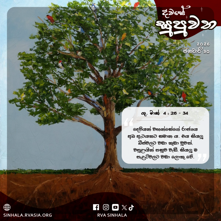 30 තවද උන් වහන්සේ මෙසේ වදාළ සේක: ”මම දෙවියන් වහන්සේගේ රාජ්යය කුමකට සමාන කරම් ද? නැතහොත් කවර උපමාවකින් එය පහදා දෙම් ද? 31 එය අබ ඇටයකට සමාන ය. එය පොළොවේ වපුරන කල මිහි පිට සියලු බීජවලට වඩා කුඩා වුවත්, 32 වපුළායින් පසුව වැඩී, සියලු ම පැළෑටිවලට වඩා ලොකු වේ. එහි සෙවණෙහි අහසේ කුරුල්ලන්ට ලගින්න හැකි වන තරම් විශාල අතු එය විහිදුවන්නේ ය.”