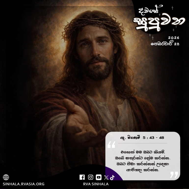 43 ” ‘නුඹේ අසල්වැසියාට ප්රේම කරන්න, සතුරාට වෛර කරන්නැ’යි කී බව ඔබ අසා ඇත. 44 එහෙත් මම ඔබට කියමි, ඔබේ සතුරන්ට ප්රේම කරන්න; ඔබට පීඩා කරන්නන් උදෙසා යාච්ඤා කරන්න. 45 මෙසේ ඔබ ස්වර්ගයෙහි වැඩ සිටින ඔබේ පියාණන් වහන්සේගේ පුත්රයෝ වන්නහු ය. කුමක් නිසා ද, උන් වහන්සේ දුදනන් හට හා සුදනන් හට තම හිරු එළිය උදා කරවන සේක; දමිටුන් හට හා අදමිටුන් හට වැසි වස්වන සේක. 46 ඔබට ප්රේම කරන්නන්ට පමණක් ඔබ ප්රේම කරන්නහු නම්, එයින් ඇති විපාකය කුමක් ද? අයකැමියෝ පවා එසේ නොකරත් ද? 47 ඔබේ සහෝදරයන්ට පමණක් ඔබ ආචාර කරන්නහු නම්, එහි ඇති විශේෂය කුමක් ද? විජාතිකයෝ පවා එසේ නොකරත් ද? 48 එබැවින් ඔබේ ස්වර්ගීය පියාණන් වහන්සේ සර්ව සම්පූර්ණ ව සිටින්නාක් මෙන් ඔබ ද සර්ව සම්පූර්ණ වන්න.”