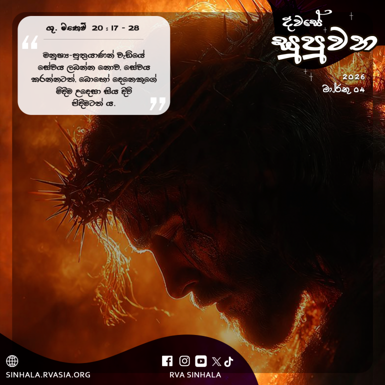 17 ජේසුස් වහන්සේ ජෙරුසලමට යමින් සිටි සේක්, අතරමඟ දී ප්රේරිතයන් දොළොස් දෙනා වෙන් කොට ගෙන ඔවුන්ට කතා කොට, 18 ”දැන් අපි ජෙරුසලමට යම්හ. මනුෂ්ය-පුත්රයාණෝ නායක පූජකයන්ටත්, විනයධරයන්ටත් පාවා දෙනු ලබන සේක. ඔව්හු එතුමාණන් මරණයට නියම කොට, 19 කවටකම් කිරීම ද තැලීම ද කුරුසියෙහි ඇණ ගැසීම ද සඳහා විජාතීන්ට පාවා දෙති. එහෙත්, තුන් වන දා එතුමාණෝ උත්ථාන කරනු ලබන සේකැ”යි වදාළ සේක. 20 එකල සෙබදීගේ පුත්රයන්ගේ මව ඇගේ පුත්රයන් හා සමඟ උන් වහන්සේ වෙත අවුත්, දණින් වැටී, එක් වරයක් ඉල්ලුවා ය. 21 උන් වහන්සේ කතා කරමින්, ”ඔබ කුමක් ඉල්ලන්නෙහි දැ”යි ඇයගෙන් ඇසූ සේක. ඈ පිළිතුරු දෙමින්, ”ඔබගේ රාජ්යයෙහි දී මේ මාගේ පුතුන් දෙදෙනාගෙන් එක් කෙනෙකු ඔබගේ දකුණු පසෙහි ද එක් කෙනෙකු වම් පසෙහි ද හිඳගැනීමට නියම කළ මැනවැ”යි කීවා ය. 22 එහෙත්, ජේසුස් වහන්සේ උත්තර දෙමින්, ”ඔබ ඉල්ලන්නේ කුමක් දැ යි ඔබ ම දන්නේ නැත. මා බොන්න යන දුක් වේදනා නමැති කුසලානෙන් බොන්න ඔබට හැකි දැ”යි ඇසූ සේක. ”අපට හැකි ය”යි ඔව්හු පිළිතුරු දුන්හ. 23 උන් වහන්සේ ඔවුන්ට කතා කොට, ”සැබැවින් ඔබ මාගේ කුසලානෙන් බොන්නහු ය. එහෙත් මාගේ දකුණු පසෙහි ද වම් පසෙහි ද හිඳගන්න දීම මා සතු දෙයක් නොවේ. මාගේ පියාණන් විසින් ඒවා යම් අය සඳහා නියම කරන ලද්දේ ද ඒවා අයිති ඔවුන්ට ය”යි වදාළ සේක. 24 දස දෙනා එපවත් ඇසූ විට ඒ සොහොයුරන් දෙදෙනා ගැන කෝප වූ හ.