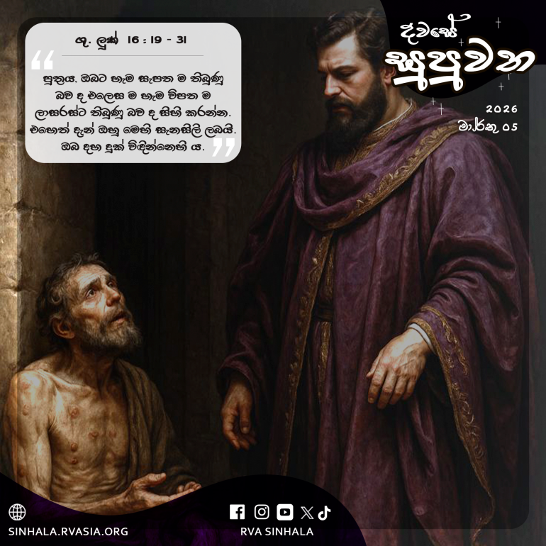 19 ”අගනා නීල-රක්ත වස්ත්ර හා සිනිඳු සේද රෙදි හැඳගත්, හැමදා සැප විහරණයෙන් කල් යැවූ එක් ධනපතියෙක් වී ය. 20 ඔහුගේ නිවසේ දොරටුව ළඟ ඇඟ පුරාම වණ තිබූ ලාසරස් නම් එක් හිඟන්නෙක් ගෙනවුත් තබන ලදී. 21 ඔහු ධනපතියාගේ කෑම මේසයෙන් වැටෙන කැබැලිවලින් වුව ද සාගිනි නිවා ගැනීමට සතුටු විය. බල්ලෝ පවා ඔහුගේ වණ ලෙව කෑවෝ ය. 22 ඒ හිඟන්නා මියගිය පසු දේව දූතයන් විසින් ඔහු ආබ්රහම් ළඟට ගෙන යන ලද්දේ ය. ධනපතියාත් මැරී භූමිදාන කරන ලද්දේ ය. 23 ඔහු ආත්ම භවනෙහි වධ විඳිමින් ඇස් ඔසවා ආබ්රහම් ද ඔහුගේ තුරුල්ලේ හුන් ලාසරස් ද දුරින් දැක, 24 මොරගසා, ‘ආබ්රහම් පිය තුමෙනි, මට කරුණා කොට, තම ඇඟිලි තුඩ දියේ ගල්වා, මාගේ දිව තෙමාලන පිණිස ලාසරස් එවනු මැනව: මන්ද, මම මේ ගිනි ජාලාවෙහි දහ දුක් විඳිමි’යි කී ය. 25 එහෙත් ආබ්රහම් පිළිතුරු දෙමින්, ‘පුත්රය, ඔබ ජීවත් ව සිටිය දී, හැම සැපත ම ඔබට තිබුණු බව ද එලෙස ම හැම විපත ම ලාසරස්ට තිබුණු බව ද සිහි කරන්න. එහෙත් දැන් ඔහු මෙහි සැනසිලි ලබයි; ඔබ දහ දුක් විඳින්නෙහි ය. 26 එපමණකුත් නොවේ. මොබින් ඔබ වෙත යාමට වත් ඔබින් අප වෙත ඒමට වත් කැමැති වූවන්ට එය කළ නොහැකි වන සේ ඔබ හා අප හා අතර පරතරයක් පිහිටුවා ඇතැ’යි කී ය. 27 එවිට ධනවතා, ‘එසේ නම් පිය තුමෙනි, මාගේ සහෝදරයෝ පස් දෙනෙක් සිටිති; 28 ඔවුන් ද මේ වධ වේදනා ඇති ස්ථානයට නොපැමිණෙන පිණිස, ඔවුන්ට අවවාද දෙන්නට ලාසරස් මාගේ පියාගේ ගෙදරට යවන මෙන් ඉල්ලමි’යි කී ය. 29 එහෙත්, ආබ්රහම් කතා කොට: ‘මෝසෙස් සහ දිවැසිවරයෝ ඔවුන්ට සිටිති. ඔව්හු ඔවුන්ට සවන් දෙත් වා’යි කී ය. 30 ඔහු කතා කොට, ‘එසේ නොවේ, ආබ්රහම් පිය තුමෙනි, මළවුන් කෙරෙන් එකකු ඔවුන් වෙත ගියොත් ඔවුන් පසුතැවී සිත් හරවා ගනු ඇතැ’යි කී ය. 31 ආබ්රහම් පිළිතුරු දෙමින්, ‘ඔව්හු මෝසෙස්ටත් දිවැසිවරයන්ටත් සවන් නොදෙත් නම්, මළවුන්ගෙන් උත්ථානයට පැමිණියෙකු වුව ද ඔව්හු විශ්වාස නොකරති’යි ඔහුට කී ය.”