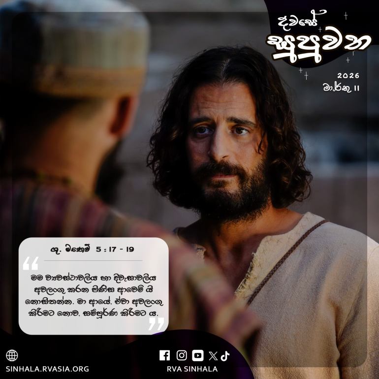 17 ”මම ව්යවස්ථාවලිය හා දිවැසාවලිය අවලංගු කරන පිණිස ආවෙමි යි නොසිතන්න. මා ආයේ, ඒවා අවලංගු කිරීමට නොව, සම්පූර්ණ කිරීමට ය. 18 සැබැවින් ම මම ඔබට කියමි, අහස හා පොළොව පහ ව ගියත්, සියල්ල පරිපූර්ණ වන තුරු, ව්යවස්ථාවලියෙන් ඉස්පිල්ලක් වත් පාපිල්ලක් වත් පහ වී නොයන්නේ ම ය. 19 එබැවින් මේ ආඥාවලින් ඉතා සුළු එකක් වත් කඩ කරන හා කඩ කරන ලෙස මිනිසුන්ට උගන්වන කවරෙකු වුව ද, ඔහු ස්වර්ග රාජ්යයෙහි ඉතා සුළු ය යි කියනු ලබන්නේ ය. එහෙත්, ඒවා පිළිපදින, ඒවා උගන්වන කවරෙකු වුව ද, ඔහු ස්වර්ග රාජ්යයෙහි උතුම් ය යි කියනු ලබන්නේ ය.