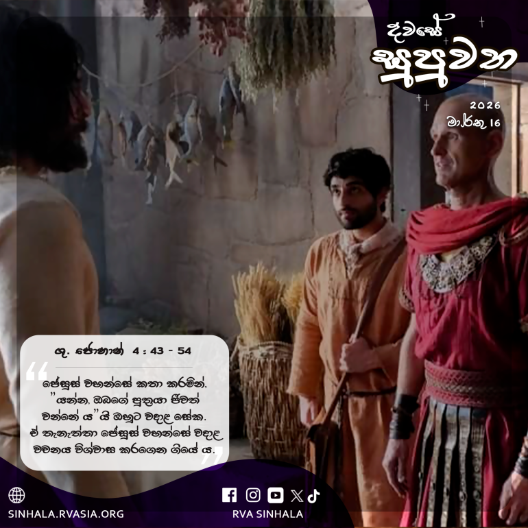 46 යළිත් උන් වහන්සේ ගලීලයේ කානා නම් ගමට වැඩම කළ සේක. උන් වහන්සේ විසින් වතුර මිදියුස බවට හරවන ලද්දේ එහි දී ය. එකල, එහි එක්තරා රාජ්ය නිලධාරියෙක් විය. ඔහුගේ පුත්රයා රෝගාතුර ව කපර්ණවුමෙහි සිටියේ ය. 47 ජේසුස් වහන්සේ ජුදයේ සිට ගලීලයට වැඩම කළ බව අසා, ඔහු උන් වහන්සේ වෙතට ගොස්, තම පුත්රයා මරණාසන්න ව සිටින බැවින්, අවුත් ඔහු සුව කරන මෙන් උන් වහන්සේගෙන් අයැද සිටියේ ය. 48 ජේසුස් වහන්සේ, ”ඔබ ලකුණු ද අරුමපුදුම දේ ද දුටුවොත් මිස විශ්වාස නො කරන්නාහු ය”යි ඔහුට වදාළ සේක. 49 රාජ්ය නිලධාරියා ද, ”මහතාණෙනි, මාගේ දරුවා මියයන්නට පෙර වැඩිය මැනවැ”යි අයැදී ය. 50 ජේසුස් වහන්සේ කතා කරමින්, ”යන්න, ඔබගේ පුත්රයා ජීවත් වන්නේ ය”යි ඔහුට වදාළ සේක. ඒ තැනැත්තා ජේසුස් වහන්සේ වදාළ වචනය විශ්වාස කරගෙන ගියේ ය.