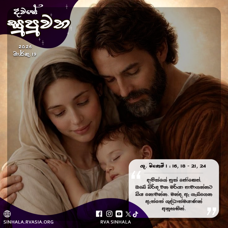 19 ඇගේ ස්වාමි පුරුෂයා වන ජෝසෙප්, සත් පුරුෂයෙකු වූ බැවින් ඇය ප්රසිද්ධියේ නින්දාවට නොපමුණුවන අදහසින්, රහසින් ඇය අත්හැරදමන්න සිතාගත්තේ ය. 20 එහෙත්, ඔහු මේ කාරණය ගැන කල්පනා කරමින් සිටිය දී, සමිඳාණන් වහන්සේගේ දූතයෙක් සිහිනයකින් ඔහුට දර්ශනය වී, ”දාවිත්ගේ පුත් ජෝසෙප්, ඔබේ බිරිඳ වන මරියා පාවාගන්නට බිය නොවන්න; මන්ද, ඈ ගැබ්ගෙන ඇත්තේ ශුද්ධාත්මයාණන් අනුහසින්. 21 ඈ පුතෙකු බිහි කරන්නී ය; උන් වහන්සේට ජේසුස් යන නාමය තැබිය යුතු ය; මන්ද, සිය සෙනඟ ඔවුන්ගේ පාපවලින් මුදාලන්නේ එතුමාණෝ ය”යි කී ය. 24 ජෝසෙප් නින්දෙන් අවදි වූ විට සමිඳාණන් වහන්සේගේ දූතයා ඔහුට අණ කළ ලෙස, සිය බිරිඳ කැන්දාගෙන ගියේ ය.