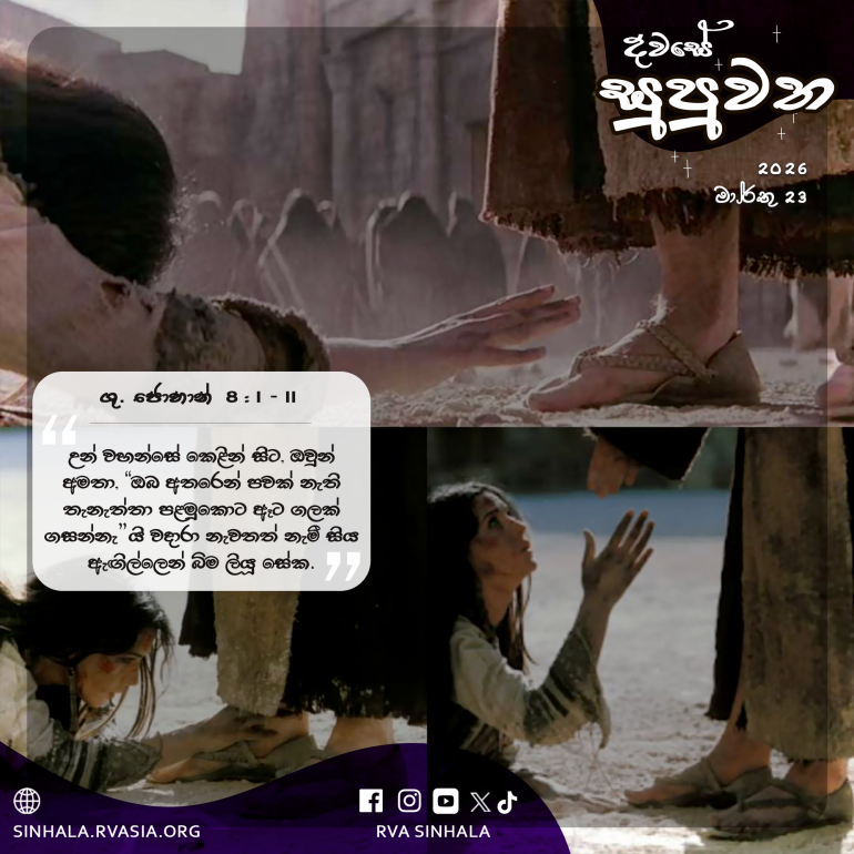 1 එහෙත්, ජේසුස් වහන්සේ ඔලීව කන්දට වැඩම කළ සේක. 2 අලුයම උන් වහන්සේ දේව මාලිගාවට වැඩිය සේක. මුළු සෙනඟ උන් වහන්සේ වෙත පැමිණියහ. උන් වහන්සේ වැඩහිඳ ඔවුන්ට උගන්වා වදාළ සේක. 3 එවිට විනයධරයෝ හා පරිසිවරු කාමමිථ්යාචාරයේ හැසිරෙද්දී ම අසු වූ ස්ත්රියක ගෙනැවිත් ඔවුන් මැද සිටුවා, 4 ”ගුරුදේවයෙනි, මේ ස්ත්රිය කාමමිථ්යාචාරයෙහි යෙදී සිටිය දී ම අල්ලාගන්නා ලද්දී ය. 5 මෙබඳු අය ගල් ගසා මරන්නට මෝසෙස් විසින් ව්යවස්ථාවෙහි අපට අණ කර ඇත; එහෙත් මැය ගැන ඔබ කියන්නේ කිමෙක් දැ”යි උන් වහන්සේගෙන් ඇසූ හ. 6 ඔවුන් මෙසේ ඇසුවේ, උන් වහන්සේ පරීක්ෂා කර උන් වහන්සේට වරද තබන්නට කරුණක් සොයාගන්නා අටියෙනි. එහෙත්, උන් වහන්සේ නැමී සිය ඇඟිල්ලෙන් බිම ලියූ සේක. 7 ඔවුන් උන් වහන්සේගෙන් දිගින් දිගට ප්රශ්න කරද්දී, උන් වහන්සේ කෙළින් සිට, ඔවුන් අමතා, ”ඔබ අතරෙන් පවක් නැති තැනැත්තා පළමුකොට ඈට ගලක් ගසන්නැ”යි වදාරා 8 නැවතත් නැමී සිය ඇඟිල්ලෙන් බිම ලියූ සේක. 9 ඔවුන් ඒ වචන ඇසූ විට, වැඩිහිටියන්ගෙන් පටන්ගෙන එකෙකා බැගින් යන්නට ගියේ ය. ඉතිරි වූයේ ජේසුස් වහන්සේ ද, ඒ ස්ත්රිය ද පමණකි. 10 ජේසුස් වහන්සේ කෙළින් සිට, ඈට කතා කොට, ”ස්ත්රිය, ඔව්හු කොහේ ද? කිසිවකු ඔබට වරද තැබුවේ නැද්දැ”යි ඇසූ සේක. 11 ”ස්වාමීනි නැතැ”යි ඈ කීවා ය. ”මමත් ඔබට වරද නොතබමි; යන්න, මින්පසු තවත් පව් නොකරන්නැ”යි උන් වහන්සේ ඇයට වදාළ සේක.