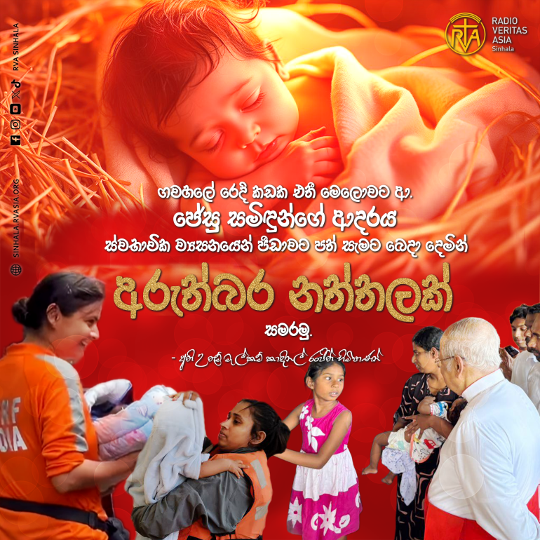 "ගවහලේ රෙදි කඩක එතී මෙලොවට ආ, ජේසු සමිඳුන්ගේ ආදරය ස්වභාවික ව්යසනයෙන් පීඩාවට පත් සැමට බෙදා දෙමින් අරුත්බර නත්තලක් සමරමු."