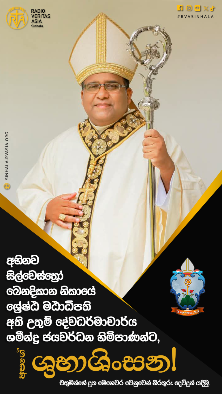 අභිනවයෙන් කැප කරන ලද සිල්වෙස්ත්රෝ බෙනදිකාන නිකායේ ශ්රේෂ්ඨ මාඨාධිපතිතුමන් වන අති උතුම් දේවධර්මාචාර්ය ශමීන්ද්ර ජයවර්ධන හිමිපාණන්ට අපේ යාච්ඤාශීලී ශුභාශිංසන එක් කරමු. අප සිරිලක් දිවයිනෙන් බිහි වූ ප්රථම ශ්රේෂ්ඨ මාඨාධිපතිතුමන් වන උන්වහන්සේට තම සහෝදර තාපසවරුන්ට සැබෑ එඩේරෙකු වෙමින් ඔවුන් නිසි මං දක්වන්නටත්, ඔවුන් සැමට සේවය සහ යාච්ඤාව තුළ කිතු සමිදුන් ජීවමාන කරන්නට කියා දෙන්නටත් අවැසි වරම් ඉල්ලා යාච්ඤා කරමු. එසේම උන්වහ්න්සේ චිරාත් කාලයක් කිතු සමිදාණන් තුළ වැජඹේවායි පතමු. දෙවියන් වහන්සේ උන්වහන්සේ සමග සිටිමින් උන්වහන්සේව රැකවල් කර සදා ආශිර්වාද කරන සේක්වා!