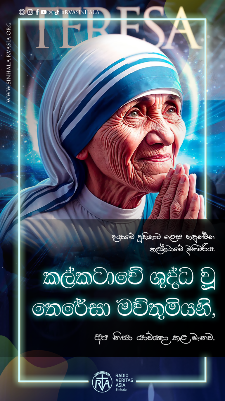 'දයාවේ දූතිකාව' ලෙස හඳුන්වන කල්කටාවේ මුනිවරිය, ශුද්ධ වූ තෙරේසා මව්තුමියනි, අප නිසා යාච්ඤා කළ මැනව.