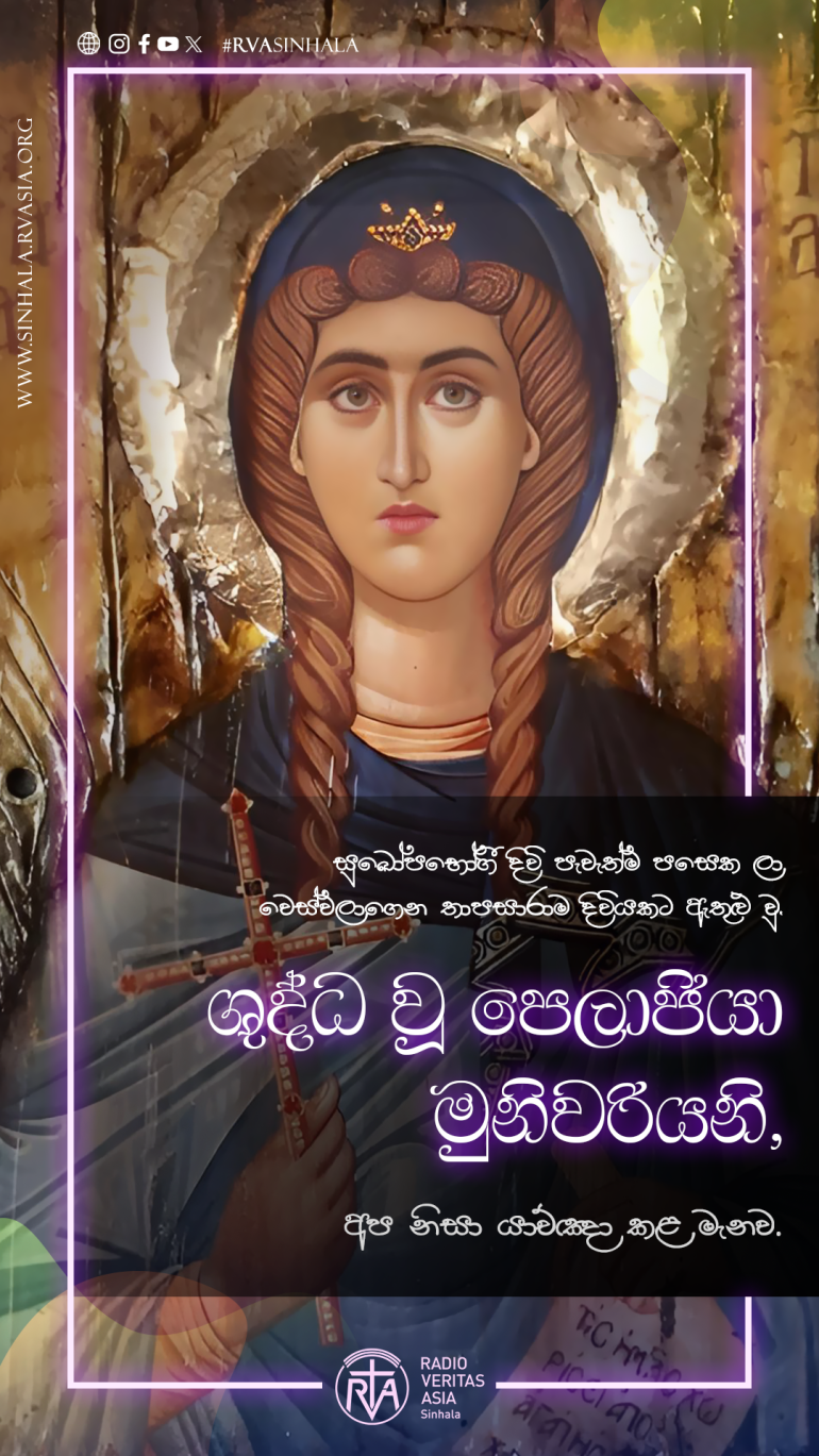 සුඛෝපභෝගී දිවි පැවැත්ම පසෙක ලා වෙස්වලාගෙන තාපසාරාම දිවියකට ඇතුළු වු, ශුද්ධ වූ පෙලාජියා මුනිවරියනි, අප නිසා යාච්ඤා කළ මැනව.