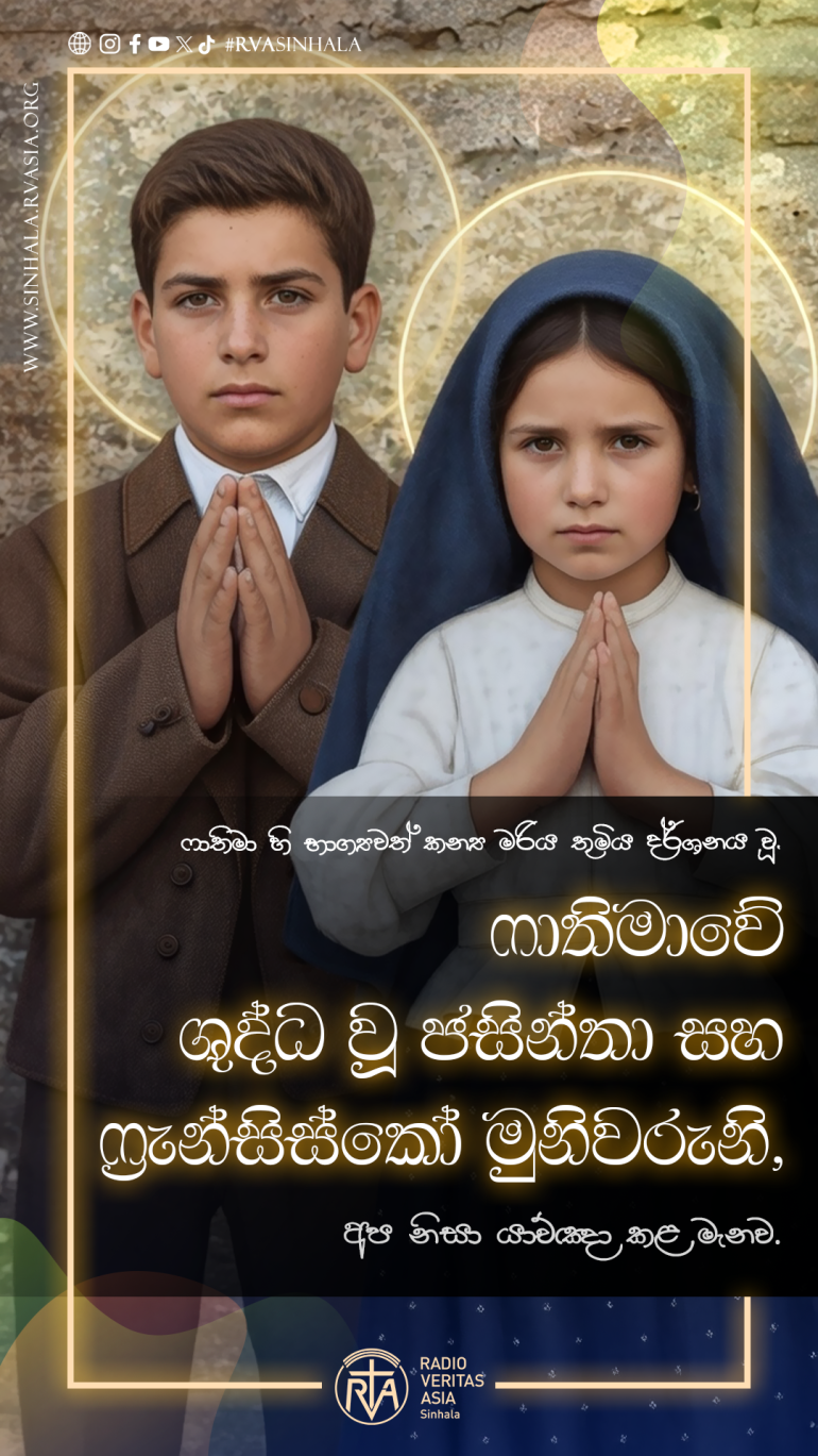 අද දින සුදුවර චරිතයෙන් පෙබරවාරි 20වන දිනට මංගල්යය යෙදෙන ෆාතිමාවේ ශුද්ධ වූ ජසින්තා සහ ෆ්රැන්සිස්කෝ මුනිවරුන් ගැන කතා කරමු.