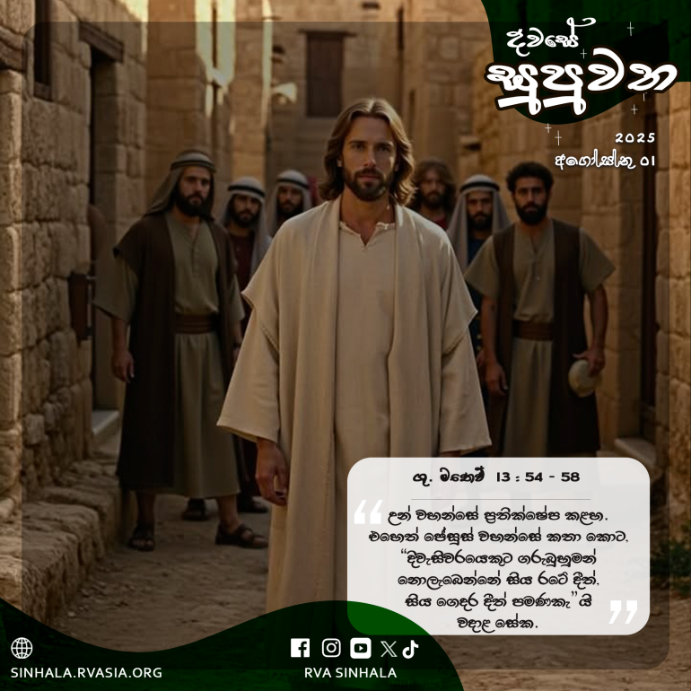 54 උන් වහන්සේ සිය රටට පැමිණ, ධර්මශාලාවේ දී ඔවුන්ට ඉගැන් වූ සේක. ඔව්හු විස්මයට පත් ව, ”මොහුට මේ ප්රඥාව හා හාස්කම් කිරීමේ බලය කොහෙන් ලැබුණේ ද? 55 මොහු වඩුවාගේ පුතා නොවේ ද? මොහුගේ මවගේ නම මරියා නොවේ ද? මොහුගේ සහෝදරයෝ ජාකොබ්, ජෝසෙප්, සීමොන් සහ ජූදස් නොවෙත් ද? 56 මොහුගේ සියලු සහෝදරියෝත් අප අතරෙහි නොවෙත් ද? එසේ නම්, මේ සියල්ල මොහුට කොහෙන් පහළ වී ද?” කියා, 57 උන් වහන්සේ ප්රතික්ෂේප කළහ. එහෙත් ජේසුස් වහන්සේ කතා කොට, ”දිවැසිවරයෙකුට ගරුබුහුමන් නොලැබෙන්නේ සිය රටේ දීත්, සිය ගෙදර දීත් පමණකැ”යි වදාළ සේක. 58 ඔවුන්ගේ අවිශ්වාසය නිසා උන් වහන්සේ එහි දී බොහෝ හාස්කම් නොකළ සේක.